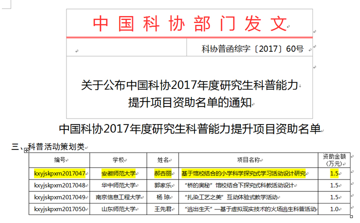 本网讯(文/图 胡旭珽)4月28日,中国科协公布《关于公布中国科协2017年度研究生科普能力提升项目名单的通知》,公司研究生郝杏丽同学申报的科普活动策划类项目《馆校结合的小学科学探究式学习活动设计研究》顺利通过评审,成功立项。