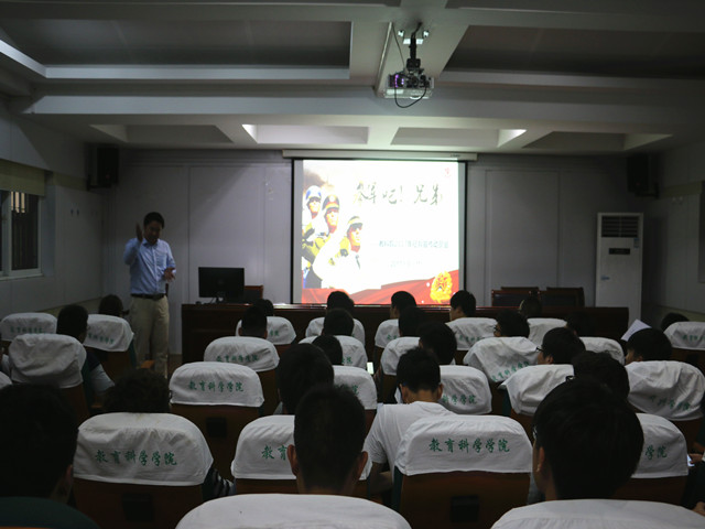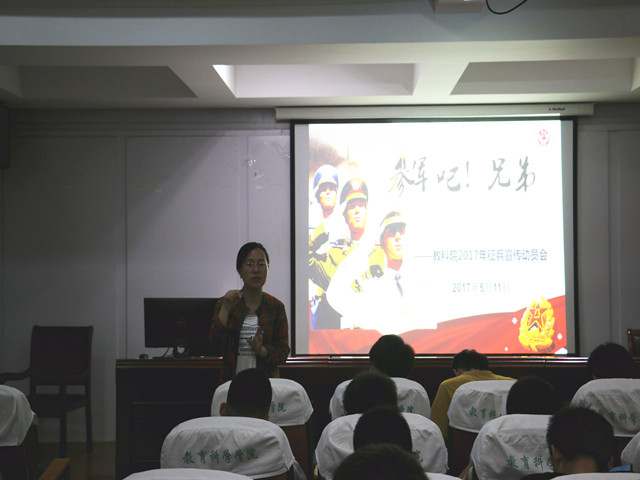 (本网讯 教科院 张启山 朱雨雁)男儿何不带吴钩,收取关山五十州。为响应国家号召,加强征兵政策宣传,教科院于5月11日中午举行了2017年征兵宣传动员会,16级全体男生参加了此次动员。本次动员会由2015级辅导员莫大贡老师主持。