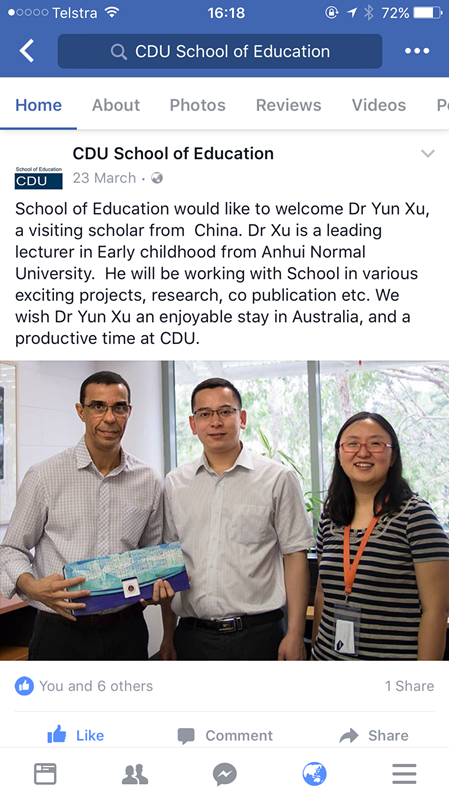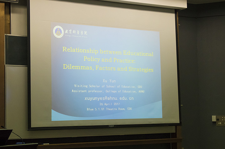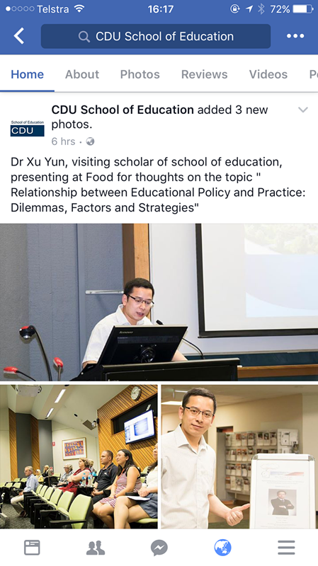 本网讯(教科院 孟庆娟 徐赟)2017年4月26日,受查尔斯●达尔文大学法律教育商科艺术学部邀请,徐赟博士在“Food For Thought: Building Ideas & Capacity seminars”上做了题为“Relationship between Educational Policy and Educational Practice: Dilemmas, Factors and Strategies”的主题演讲。教育公司脸书(Facebook)官方账号推送了此次演讲。“Food For Thought: Building Ideas & Capacity seminars”是该学部的品牌学术沙龙,意为“精神食粮:创新理念与能力的研讨会”。该沙龙是仅面向一定学历层次的专任教师开放高端学术论坛,每年邀请20名左右的来自世界各地的学者就新进研究前沿进行主题学术演讲。沙龙时间一般安排在周三中午,并为与会学者提供丰盛的食物。