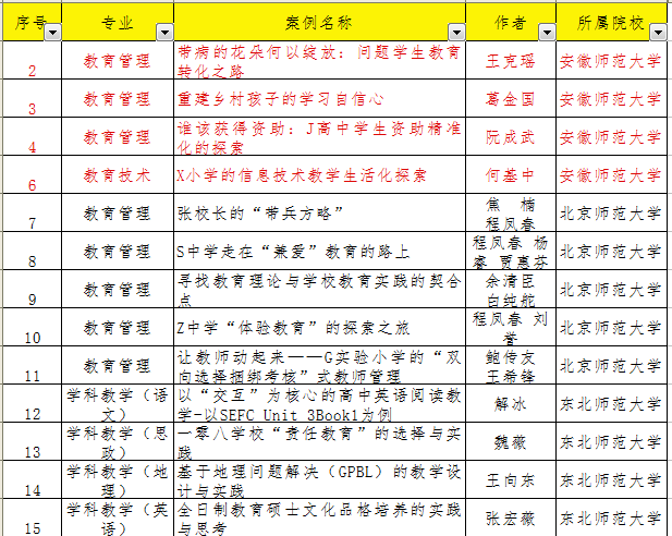 (研究生办公室)近日,全国教育专业学位研究生教育指导委员会(以下简称"教指委“)组织专家评审,公司阮成武教授撰写的《谁该获得资助:J高中员工资助精准化的探索》、葛金国老师撰写的《重建乡村孩子的学习自信心》、马家安老师指导的教育硕士王克瑶撰写的《带病的花朵何以绽放:问题员工教育转化之路》案例通过初审,王清老师指导教育硕士何基中撰写的《X小学的信息技术教员工活化探索》直接入选案例库。这些案例都是去年入选的全校首届教育专业学位优秀案例,经安徽省教育专业学位案例库和案例教学推广中心组织专家精心修改打磨的基础上推荐参评的。