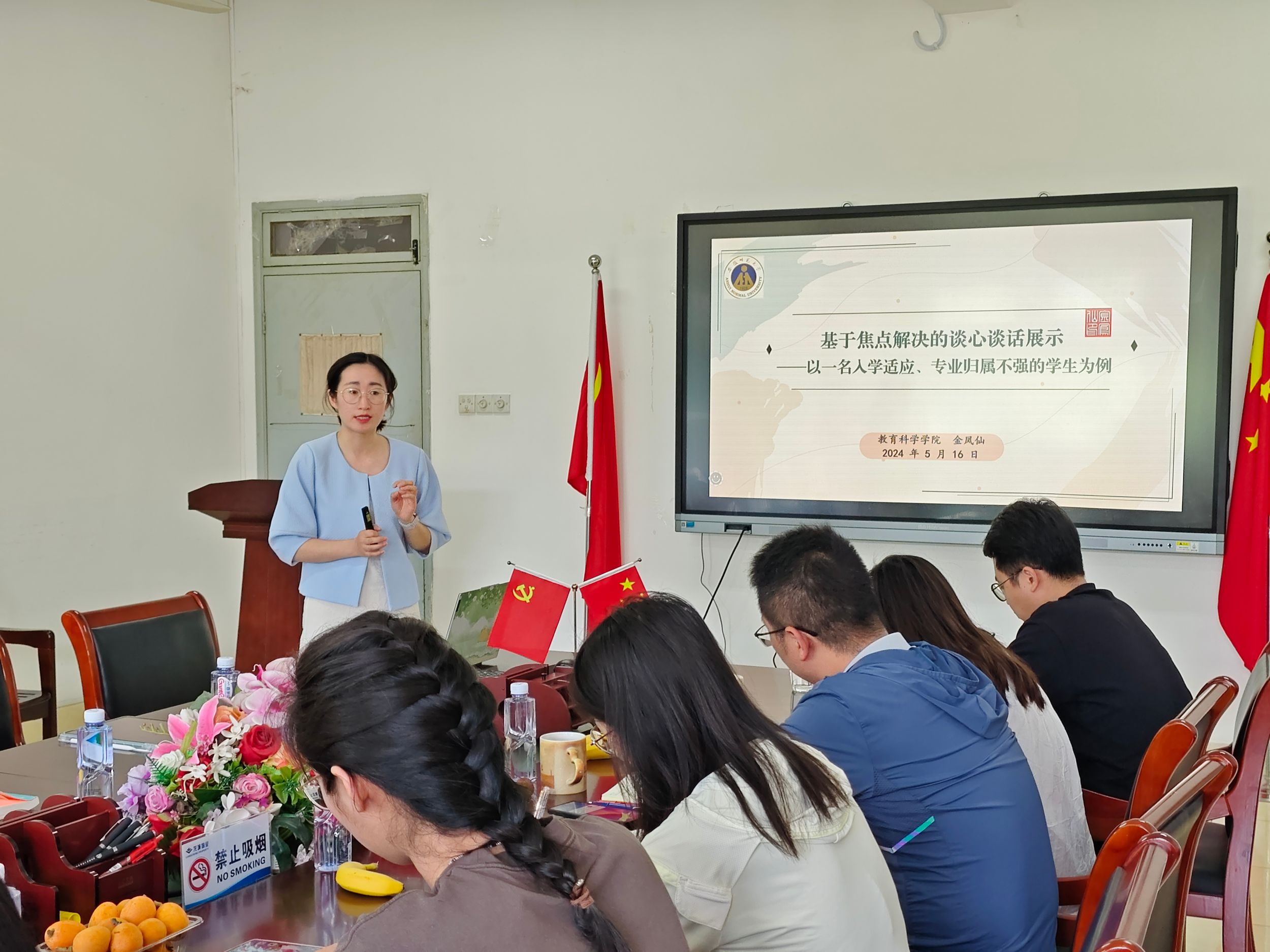 23级辅导员金凤仙从一名入学适应困难、专业归属不强的员工的案例分析入手,结合工作经验与相关培训体会分享了基于焦点解决的谈心谈话方法。通过介绍案例、谈心谈话展示,将焦点短期治疗方法结合辅导员谈心谈话事务具体展开,着力拓展辅导员谈心谈话能力。会上,杜凤结合两位辅导员的分享与公司工作实际,围绕就业指导与谈心谈话技巧与大家展开讨论,地旅公司与教科院学工队伍共同交流做法与经验。