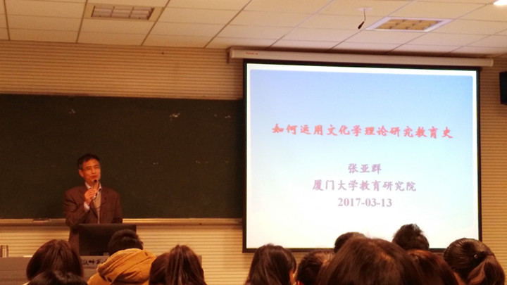 本网讯(教科院 尚梦生)时值春意盎然之际,应公司邀请,厦门大学教育研究院张亚群教授于3月13日上午,在田楼8607教室,给公司广大本科生和研究生倾情奉献了一场题为“如何运用文化学理论研究教育史”的学术讲座。