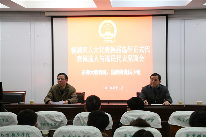 本网讯(魏文静/文 林子轶/图)公司和国教院于12月29日上午在学术交流中心共同举行镜湖区人大代表换届选举正式候选人与选民代表的见面会。教科院、国教院选民小组代表,公司党委组织部副部长谢超峰出席见面会。会议由公司党委书记刘晓宇主持。