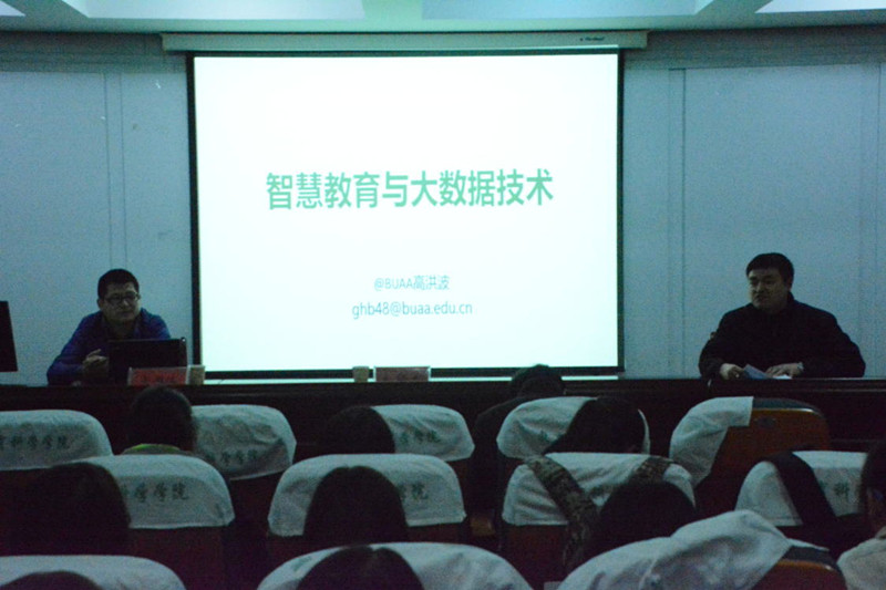 本网讯(教科院)2017年1月2日晚,北京航空航天大学高洪波博士在公司三楼学术交流中心,作题为《智慧教育与大数据技术》的学术报告。报告会由李宜江副经理主持,公司桑青松经理、相关专业教师以及教育技术学本科生与研究生到会聆听。