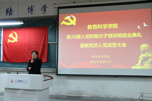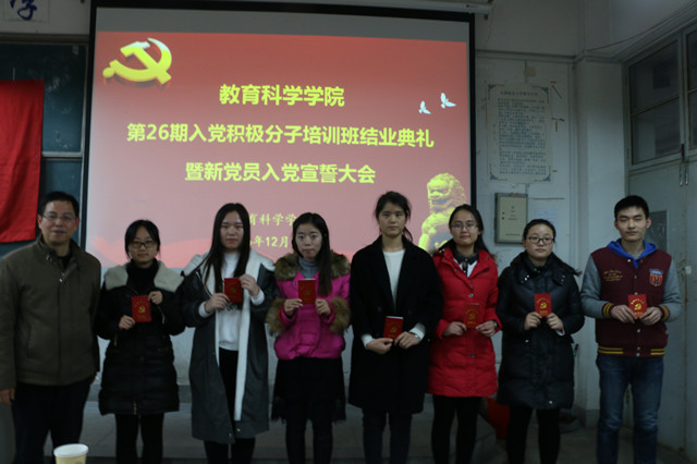 本网讯(教科院 曹玲玲)12月21日下午4:00,公司第26期入党积极分子培训班结业典礼暨新党员入党宣誓大会在田楼8101教室顺利召开,公司党委书记刘晓宇,公司党委副书记张如华,公司党委秘书马兴以及院第26期入党积极分子培训班学员、本期发展的预备党员和正式党员出席了本次大会。大会由党校班班主任莫大贡主持。