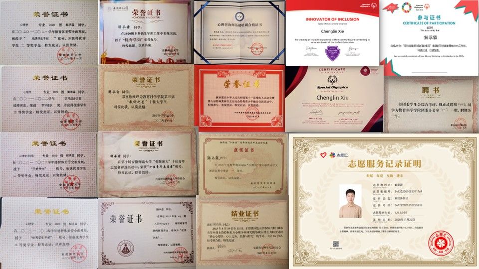 心理学是他的兴趣所在,大学四年期间,他一直不断精进自身专业素养,四年综合素质成绩位于班级前10%,连续四年获得校奖学金,参加中科院心理所的心理咨询师培训。无论在学习上还是生活上,解承霖同学都严格要求自己,锐意追求进步,积极向党组织靠拢,是党校培训班中的“优秀学员”,获评2024“教科之星”十佳老员工。