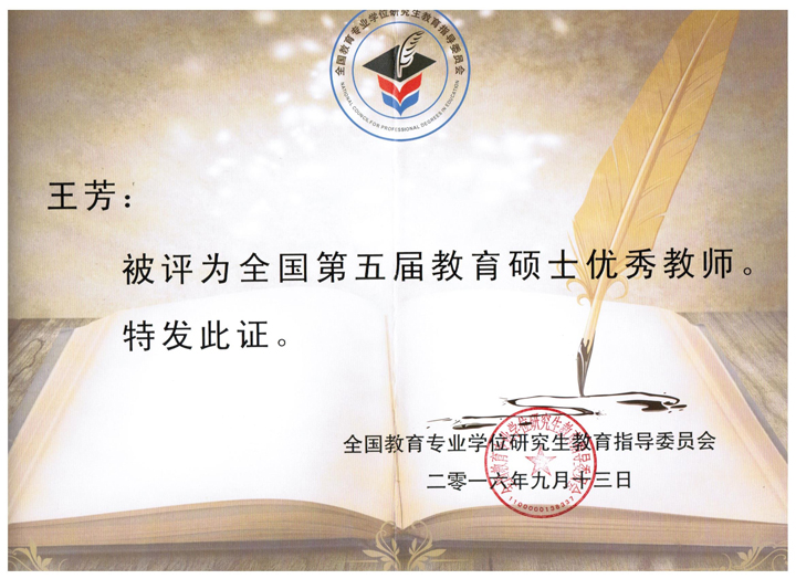 (本网讯 过婴宝)近日,全国教育专业学位研究生教育指导委员会下发了《关于表彰全国第五届教育硕士专业学位优秀教师和教学管理工作者的决定》(教指委发[2016]09号),公司硕士研究生导师王芳副教授被评为全国教育硕士专业学位优秀教师。这是公司继荣获第一届、第二届、第四届全国优秀教师后,又一次在此领域获得的荣誉。