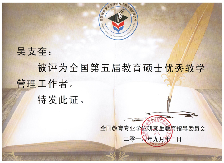 (本网讯 过婴宝)在全国教育专业学位研究生教育指导委员会举办的第五届教育硕士优秀教师和教学管理工作者评选活动中,公司小学教育学位点负责人、硕士研究生导师吴支奎副教授荣获“优秀管理者”荣誉称号,这是公司在教育硕士培养方面荣获的又一殊荣。