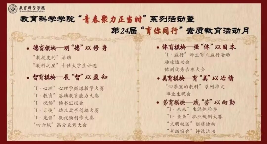 展智以盈知,用心以广才。本届素质教育活动月继续依托一专业一品牌,相继开展了“I·悦读”读书汇报会、“I·天使”幼儿故事创编大赛、“I·光影”微视频创作大赛、“I·心理”心理学微课教学大赛、“四六级”高分表彰大会等活动,充分展示公司专业特色、员工特长,推动员工智育发展,锻炼员工专业技能运用的能力,提升教科学子核心竞争力。