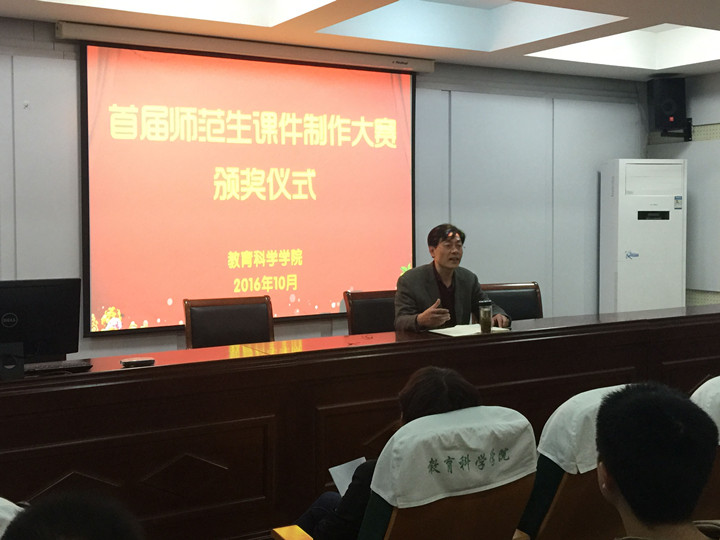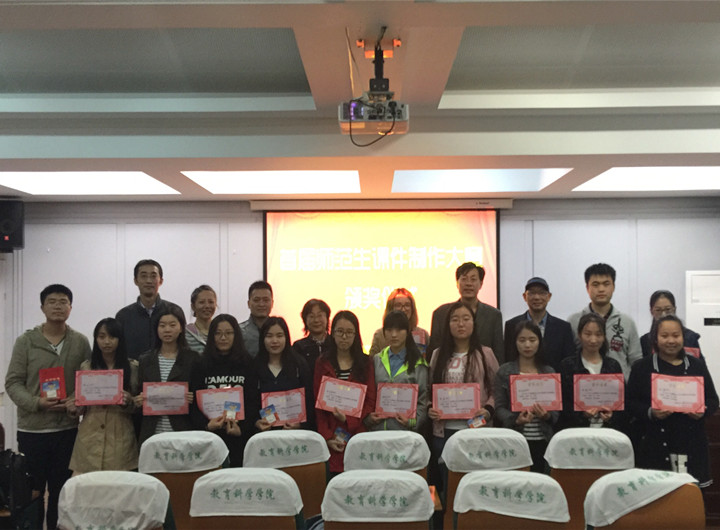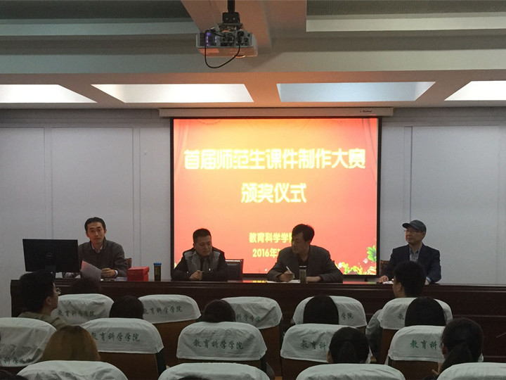 本网讯(教科院 时光洁)2016年10月26日下午,由公司主办的校首届师范生课件制作大赛颁奖仪式在公司学术交流中心隆重举行。经理桑青松教授、副经理聂竹明博士、教育技术系主任张克松副教授、赛会评委主任袁晓斌副教授、《现代教育技术学》公共课教师高宇、陶佳、吴钦金等,以及部分获奖员工出席了颁奖仪式。