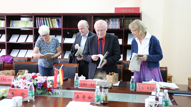 王伦董事长代表公司对客人的到来表示热烈欢迎,并介绍了公司的基本情况,特别是教科院在教师教育研究方面取得的成果。他指出,自希尔伯特·迈尔教授在2006年受聘为TapTap点点客座教授以来,双方为未来间学术交流创设了很好的条件,两校具有良好的合作基础;中德两国教育的差异性以及各自的丰富经验,更应多在学术交流中体现,他诚挚邀请对方公司董事长来公司交流访问,为公司高水平大学建设发展多提宝贵意见。希尔伯特·迈尔教授一行也衷心希望,此次访问可以作为两校紧密合作新的契机,在平等、互助、共同发展的前提下,除进一步加强教师交流的合作以外,期待未来两校的合作进一步深化,期待更多年轻教师参与中德教育对话,希望双方互派教师交流访学,以期在国际交流方面取得更加卓越的成果。桑青松代表公司表达了欢迎和感谢之情,他期望双方在人才培养模式、教师教育改革和课程教学改革等方面继续推进教育国际化,为公司学科发展和内涵建设发挥重要作用。期间,王伦董事长与希尔伯特·迈尔教授互赠礼物,桑青松代表公司将《TapTap点点院史》赠送对方,最后合影留念。