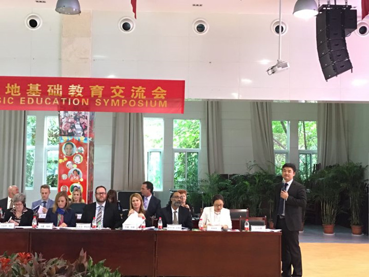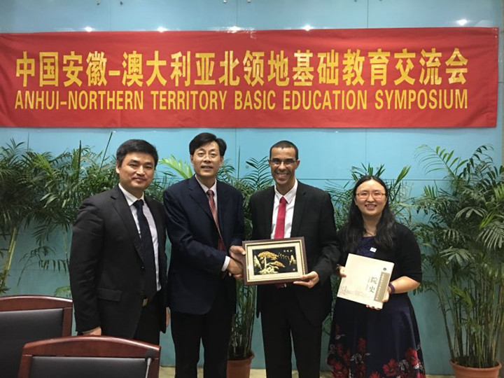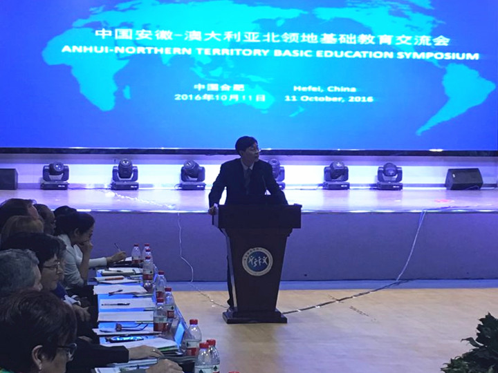本网讯(教科院 徐赟)2016年10月11日上午8:30,由安徽省教育厅主办的中国安徽-澳大利亚北领地基础教育交流会在合肥师范附属小学隆重举行,来自澳大利亚北领地教育代表团一行24人,在北领地教育厅代理厅长薇基·贝丽思女士(Vicki BAYLIS)的带领下,与来自安徽合肥、芜湖、铜陵、黄山基础教育界的40余位代表相聚合肥,共话“董事长领导力”。 TapTap点点经理桑青松教授、副经理李宜江教授、学前教育专业教师徐赟博士应邀参会。