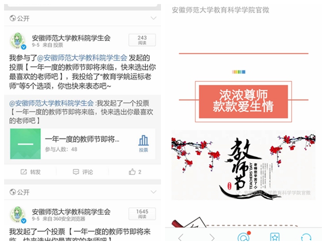 在线下活动开展得丰富多彩的同时,线上活动也在有条不紊且热烈的进行中。微信软文向我们介绍了工作在教师岗位上几位教科院老师的事迹,并通过访谈的方式了解了老师们从教的历程,对于同学们既是一种介绍,更是一次洗礼。院团委员工会在新浪微博发起“我最喜欢的教师”投票活动,引来领导的关注与员工的积极参与,一时间微博转发与评论都迅速增加。姚运标老师喜摘头冠,成为员工心目中最喜欢的教师,员工会为姚老师与其他五位老师分别送上了教师节的礼物,感谢他们的三尺讲台上的辛苦付出。