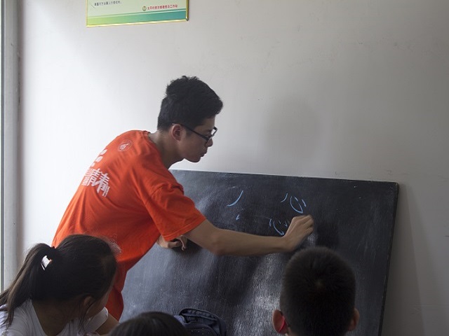 手工折纸课后,美术课正式开始。一块小小的黑板,几根白色的粉笔,承载着孩子们无限的想象。一只小青蛙,一条小金鱼,孩子们在绘画的过程中感受到小动物的美丽。虽然孩子们的画没有涂颜色,但队员们仿佛看到了一幅幅色彩缤纷的美丽作品,探寻到了孩子们那天马行空的想象世界。