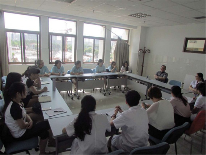 会议在心理科主任郑欣的简短而又风趣幽默的一段话后正式开始。首先是心理治疗师杨娟给大家讲述了一个精神分裂症患者的案例,听完治疗师的案例后,大家都意识到一个问题:患者不太配合治疗师的工作,那么该如何改善现状呢?于是,所有参与人员就这个问题展开了讨论。王芳老师说:“我认为与其建立信任关系很重要。因为信任是沟通的前提,所以能获得患者的信任是第一步。可以通过更加真诚地对待患者来感染他。”我们听完后觉得很有道理。接着,心理学系的员工罗艺茹说:“我认为共情很重要。我们应该理解患者的行为并理解他的感受,只有这样患者才会觉得我们是有共鸣的并且才有进一步深入沟通的可能。”接着,心理系徐明芳等员工也说了自己的想法。当有不同意见时,大家会积极地讨论起来,所以会议室的气氛还是很活跃的。