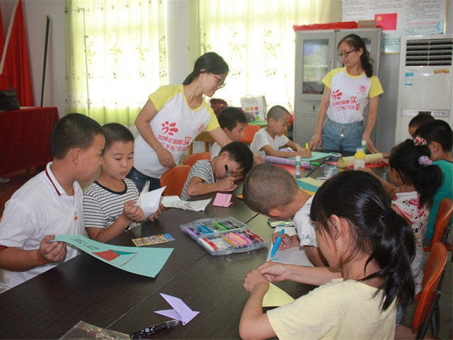 “小朋友们,今天给大家带来的是美术课呦!不要求大家画出多么好看的作品,只希望可爱的你们画出一栋你们想要住进去的房子。等你们画好了,我会请两位小朋友和我们分享他的房子的故事。”队员马淼淼说。10分钟后,洛欣分享了她的房子的故事:“我想住的房子很简单,普通的青砖白瓦房子就好,但是超级希望爸爸妈妈能够常年陪我住在这个房子里。妈妈每天都会为我准备可口的早餐,爸爸每天都会去校门口接我放学......”讲到动情处,洛欣不禁哽咽了。其他的小朋友看到此情景后纷纷安慰洛欣。与此同时,队员马淼淼说道:“其实我小的时候也超级希望爸爸妈妈能陪在我身边,没有他们的陪伴我觉得我比其他小朋友可怜,我觉得自己没有人疼。可是稍微长大一点后我就不那么想了,我有爱我的爷爷奶奶,有善良的朋友,有亲切的老师,还有很多对我好的人。我觉得我是幸运的,我相信你们也一定感受到过来自身边的人的关心吧?”听完这番话,孩子们终于破涕为笑了,又都雀跃了起来。