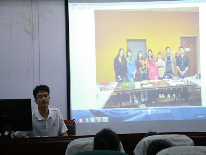 刘钊颖和徐宏进分别从专业学习和业余生活入手,展示了大量在学习、生活、交际等方面的照片,将一年来的经历用风趣的语言向在场的同学娓娓道来。在这一年留学中,两位研究生同学迅速融入到新的学习生活环境中,充分利用国外高校的优质教育资源,转变思维方式和观念,勤奋刻苦学习专业知识。学习了包括网站建设、3D打印技术、创客工厂、多媒体技术应用等数十门专业课程。期间,他们在导师Templar教授带领下,参加了在孟菲斯举办的田纳西州教育技术论坛,切身感受了美国学术交流独特的魅力,并将论坛上听到的精彩报告、前沿知识和全新的思维方式分享给现场的同学们,令大家深受启发。随后,他们结合自身体验,向同学们介绍美国教育的概况和中美之间的诸多学习关于、文化、习俗方面的差异,并热情耐心的回答了同学们的提问。
