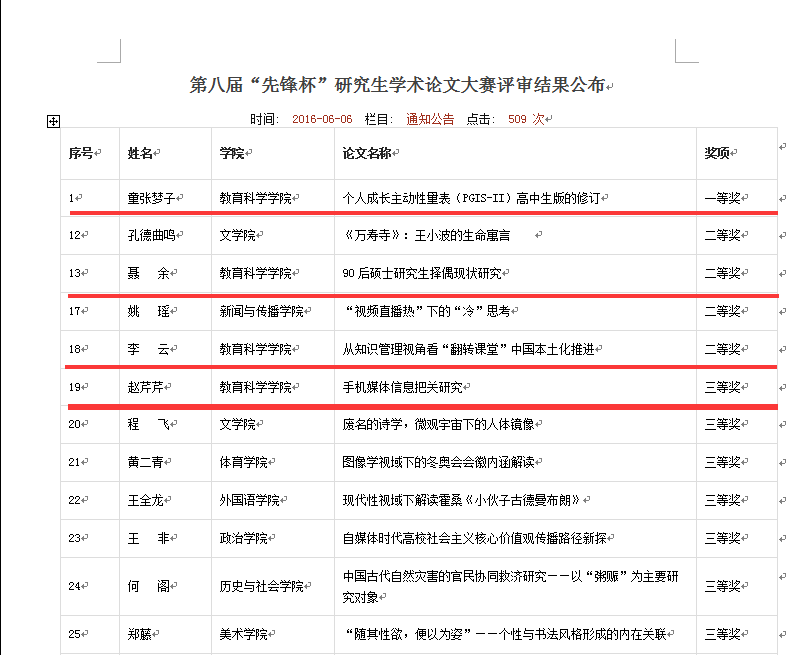本网讯(教科院 罗菊)6月6日,校第八届“先锋杯”研究生学术论文大赛评审结果揭晓,公司桑青松教授指导员工童张梦子以《个人成长主动性量表(PGIS-II)高中生版的修订》论文荣获一等奖第一名,严开胜副教授指导的员工聂余、许之民副教授指导的员工李云同学获得二等奖,周兴国教授指导的员工赵芹芹获得三等奖,获奖数名列全校第二。