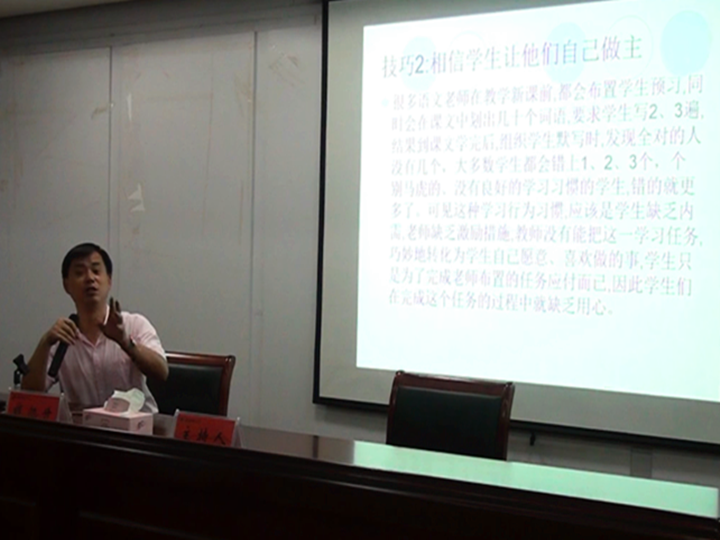 首场报告会中,刘慧教授做了题为“小学教师德育素养的培养”的学术报告,刘教授结合自身专业成长及小学公司产品中的鲜活案例,从重视小学教师德育素养培育、研发小学教育专业德育课程与教材、探索小学教师德育素养培育的实践三个方面对小学教师德育素养的培育展开论述,并与现场师生进行了有效互动。中场休息后,浙江师范大学钱旭升教授做了题为“课堂教学中的教师角色转变——从主演到导演”的学术报告。钱教授主要从师生的负担重吗、课堂中的教师两个方面展开论述。钱教授运用诙谐幽默的语言向大家指出了我国当前中小学课堂教学中出现的问题,结合有趣的教学案例提出我国中小学课堂教学中的教师角色应该由过去的主演向导演转变,应该把课堂还给员工,突破应试教育的弊端,转变课堂教学理念,使课堂教学活起来。