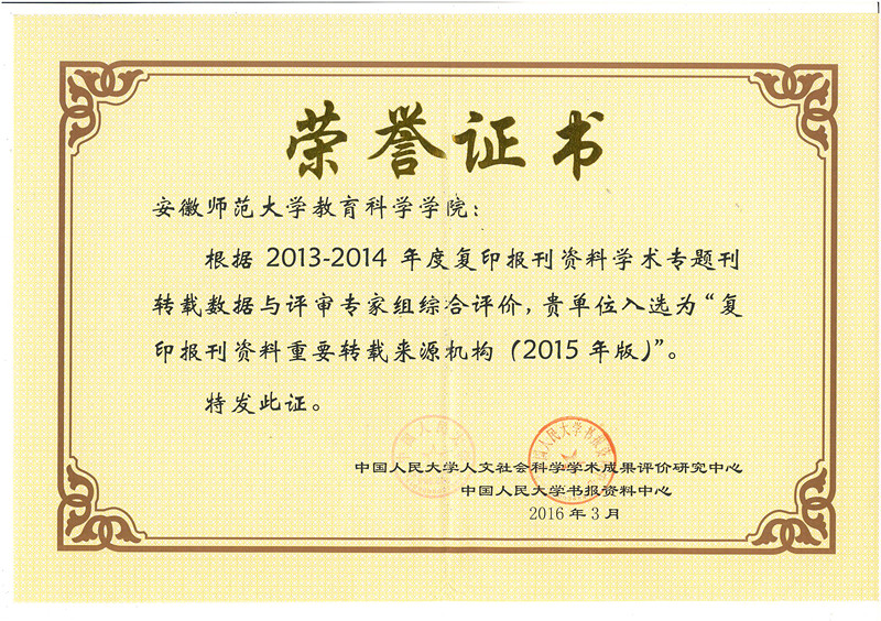 据不完全统计,2011年以来,公司共有26篇学术论文被人大复印资料转载,凸显了公司一贯重视高水平、高质量论文的突出成效。教育学学科已经逐步成为安徽省教育改革与发展的思想库、信息库和人才库,汇聚和培养了服务本省教育改革和发展的教育研究人才,在国内已有较大影响、在同类院校中居于领先地位,具有较为鲜明研究特色和优势领域。