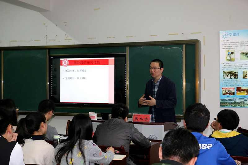 在赵老师对张礼永博士和杜成宪教授作了简单介绍之后,学术报告会正式开始。张博士以研究生的成长之路为话题,讲述了自己在研究生期间的生活经历与学习状况。然后,他以研究与研究方法为切入点,结合自己硕士论文和博士论文的写作经历,深入分析自己在论文写作的不同阶段所遇到的问题和取得的收获,向同学们阐明了运用教育科学研究方法时应注意的问题。张老师总结了自己的研究体悟和治学经验,并与同学们分享,他指出,教育研究要坚持“选题要新、视角要新、方法要新”的原则,正确处理好教育研究中常见的几对矛盾。他的发言获得了同学们的一致好评,报告结束后,同学们踊跃提问,张博士耐心地解答同学们关于研究资料搜集和论文写作方面的问题。