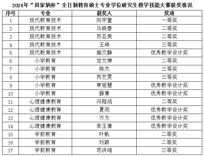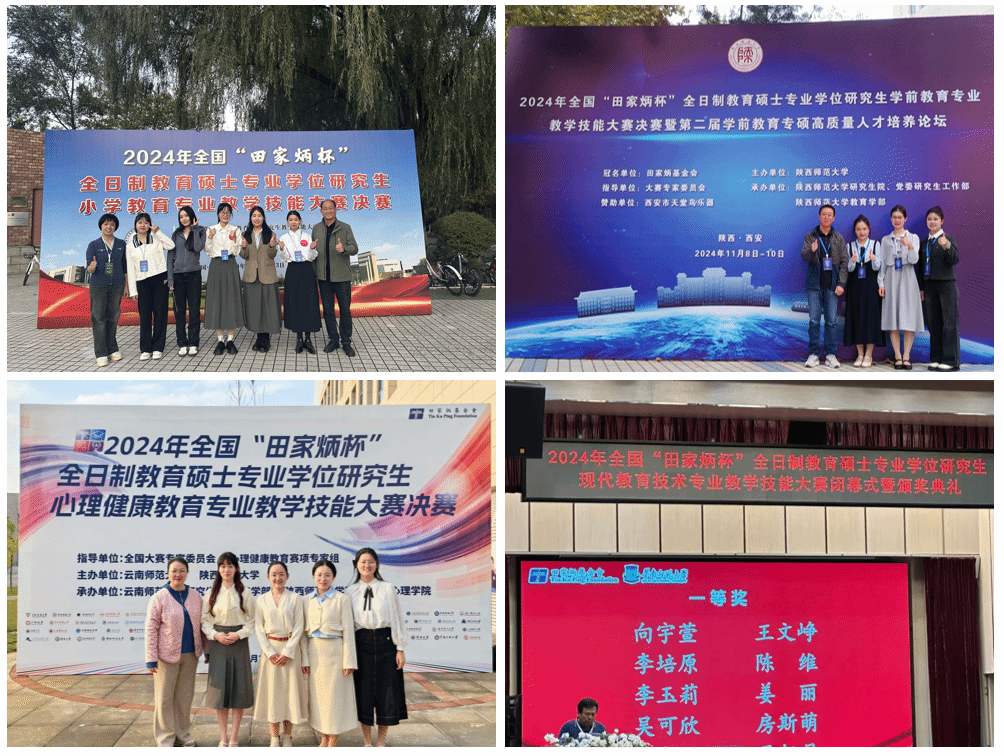 近日,教科院顺利组织小学教育、学前教育、现代教育技术以及心理健康教育四个专业员工分别赴西安、沈阳、昆明、广州等地参加2024年全国“田家炳杯”全日制教育硕士专业学位研究生技能大赛。在校研究生院的指导下,教科学子通过初赛的选拔和决赛的角逐,最终斩获一等奖1项、二等奖6项、三等奖4项以及优秀教学设计奖6项,路宝利、杨滨、袁晓斌、王清、丁园园、王成刚六位老师荣获“优秀指导教师”荣誉称号。