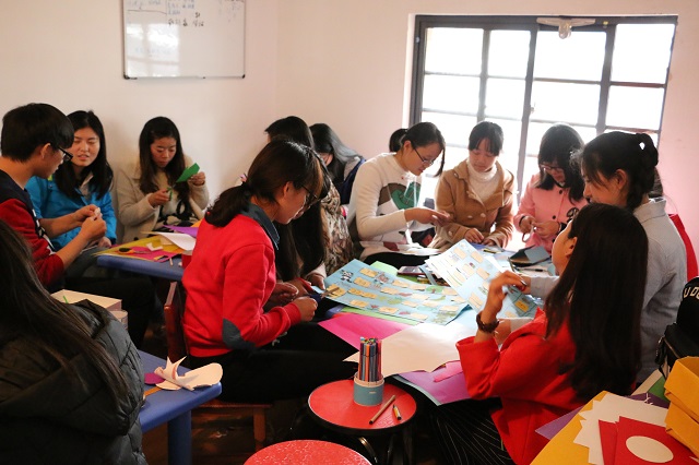 根据春芽残疾人互助协会的日常教学需求,培训班学员分为教学组和模具组,分别组织开展各项具体活动。由于自闭症儿童在感统学习和训练中注意力不易集中,这就需要孩子的家长随时陪同在孩子身边。教学组的任务就是协助照顾孩子,陪伴他们共同学习。在游戏课程中,教学组的学员们一对一坐在孩子的身后,随时观察帮助孩子;课间休息时,学员们又领着孩子去盥洗室,引导孩子运动说话等。而模具组的学员们则拿起卡纸、剪刀、尺子和画笔等制起各种感统教学所需的模具。卡通动物、拖鞋、图形匹配、数字图卡等各种模具,从学员的手中巧妙地呈现出来。