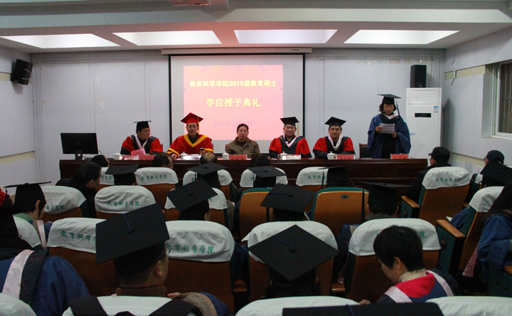 本网讯(教科院研究生 任太平)2月28日上午,公司2015届教育硕士暨同等学力学位授予仪式在院三楼学术报告厅隆重举行。公司党委书记刘晓宇、经理桑青松教授、副经理李宜江教授,院教授委员会主任周兴国教授,导师代表以及2015届教育硕士、同等学力研究生参加大会,大会由副经理聂竹明主持。