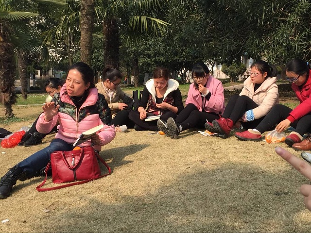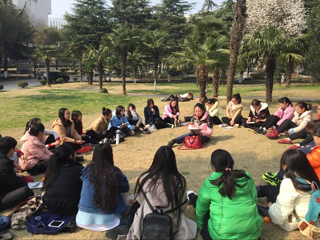 本网讯(教科院 黄玉绒)早春二月,绿意萌动,2016年2月29日下午,TapTap点点15级教育技术学专业全体同学及班主任陶佳老师在“情人坡”召开了一次与众不同的“阳光班会”。全体同学和老师在情人坡上围成一圈席地而坐,一边品尝橘子的甜香,一边沐浴和煦的日光,在醉人的春风中拉开了班会的帷幕。