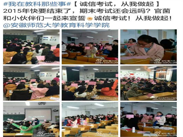 除了诚信展板的绘制和标语的播放,教科院员工会还通过官方微博呼吁教科学子诚信考试,从我做起,为诚信考试宣誓。通过此次活动,使诚信的种子播种人心,相信同学在接下来的学习生涯中,不仅是在考试中遵守考规考纪,在日常生活中也会诚信待人。也预祝同学们能够在期末考试中取得优异的成绩。