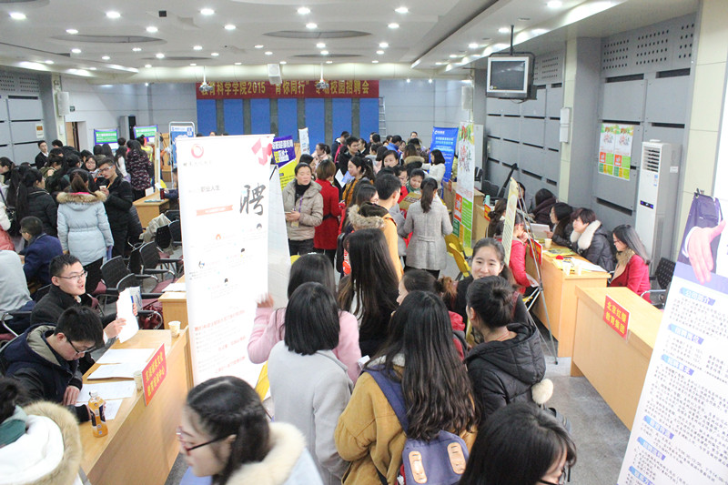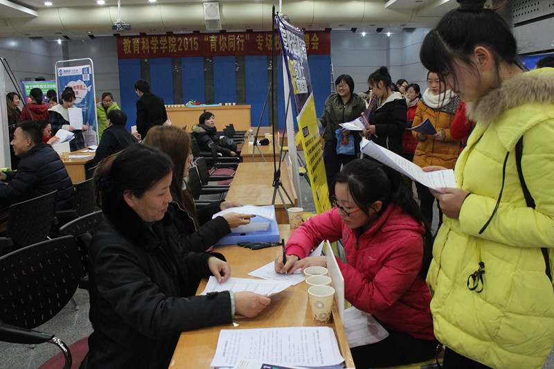 本网讯(教科院 孟庆娟 张琼文)就业是民生之本,创业是就业之源。教科院高度重视2016届毕业生就业创业工作,本学年着重以提高人才培养质量为基础,创新毕业生就业服务体系,全力推进“育你同行工程”,目前各类就业专项活动如火如荼进行中。继2014年成功举办首场“育你同行”专场校园招聘会之后,12月29日下午,该院又举行了2015“育你同行”校园专场招聘会,及时地为各位准毕业生开通了一条绿色通道。北京红缨集团合肥园区、合肥高新中加公司、易通心理咨询有限公司等来自省内外的近30家用人单位前来招聘,共提供就业岗位600余个,吸引以该院毕业生为主的公司数百名员工前来求职应聘。
