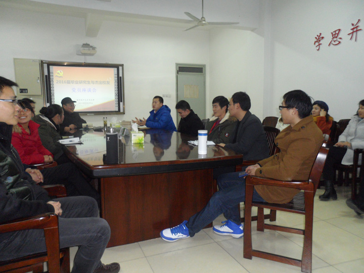 本网讯(研究生 刘婧/文 汪鹏/图)为了更好了解员工党员的工作生活,增进与优秀员工的交流,切实提高毕业班同学求职竞争力,12月29日晚,公司2016届毕业班研究生党支部在院三楼会议室召开员工党员座谈会,公司14、15届员工党员,现任职于皖南医公司的钱宇、骆成、汪国瑞、李力等四位老师来到公司,与16届毕业班党员进行了生动、深刻的交流活动,畅谈人生感悟,共话成长发展。座谈会由毕业班研究生支部书记过婴宝老师主持。