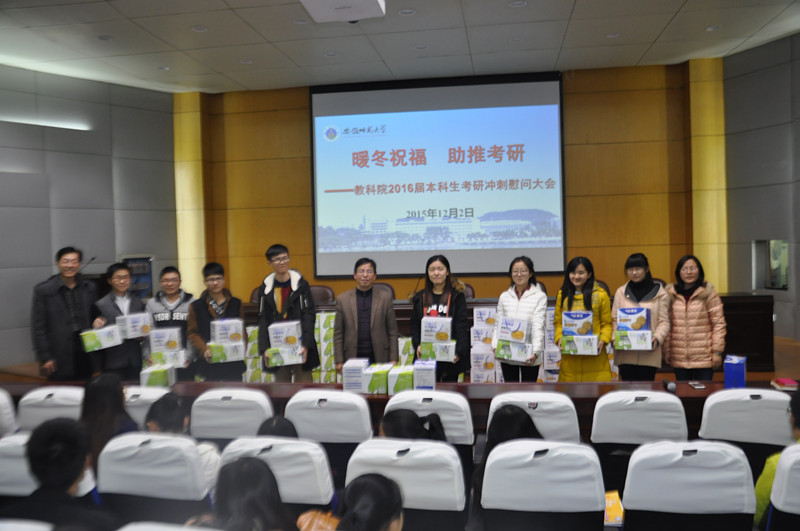 本网讯(教科院 张玉楠)不忘初心,方得始终。2015年考研即将进入攻坚阶段,为了给考研同学提供更好的服务,鼓足士气,12月2日下午,公司在田楼报告厅开展2016届本科生考研冲刺慰问。公司党政领导刘晓宇、张如华、桑青松、阮成武在2012级辅导员孟庆娟的陪同下专程慰问考研学子,并与同学们进行了亲切交谈。
