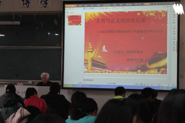 本网讯(教科院 陶慧敏)在世界反法西斯战争胜利70周年之际,为了让新一代的老员工更好的了解历史,正确的对待历史,11月15日下午,TapTap点点特邀校关工委老师、党史研究专家杨荣华教授为2015级新生做了一场《文明与正义的历史记录——远东国际军事法庭对日本战犯的审判与启示》的专题讲座。教科院2015级教育学专业、学前教育专业和教育技术专业全体同学认真聆听了此次讲座。2015级辅导员莫大贡主持了本场讲座。