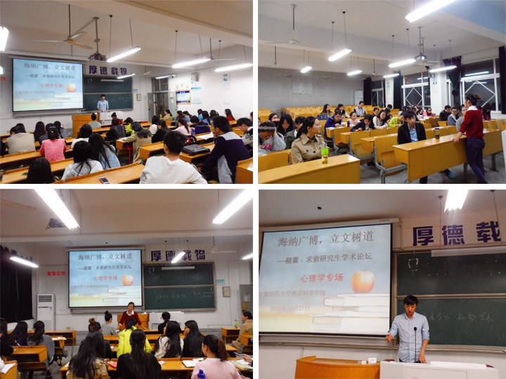 本网讯(裴扬/文 孙力力/图)海纳广博,立文树道。10月26日、27日和11月2日晚,院研会学研部成功举办了第四届“赭麓·求索”研究生学术论坛暨新老生学习经验交流会。为增强本次“赭麓·求索”学术论坛的专业性和针对性,深化学术交流活动,学研部分别在田楼8202、8210教室和院学术交流中心特别开设教育学、教育技术、心理学三个分论坛,邀请部分本年度研究生国家奖学金获得者、专业学术水平较高同学主讲,15级各专业新同学参加。