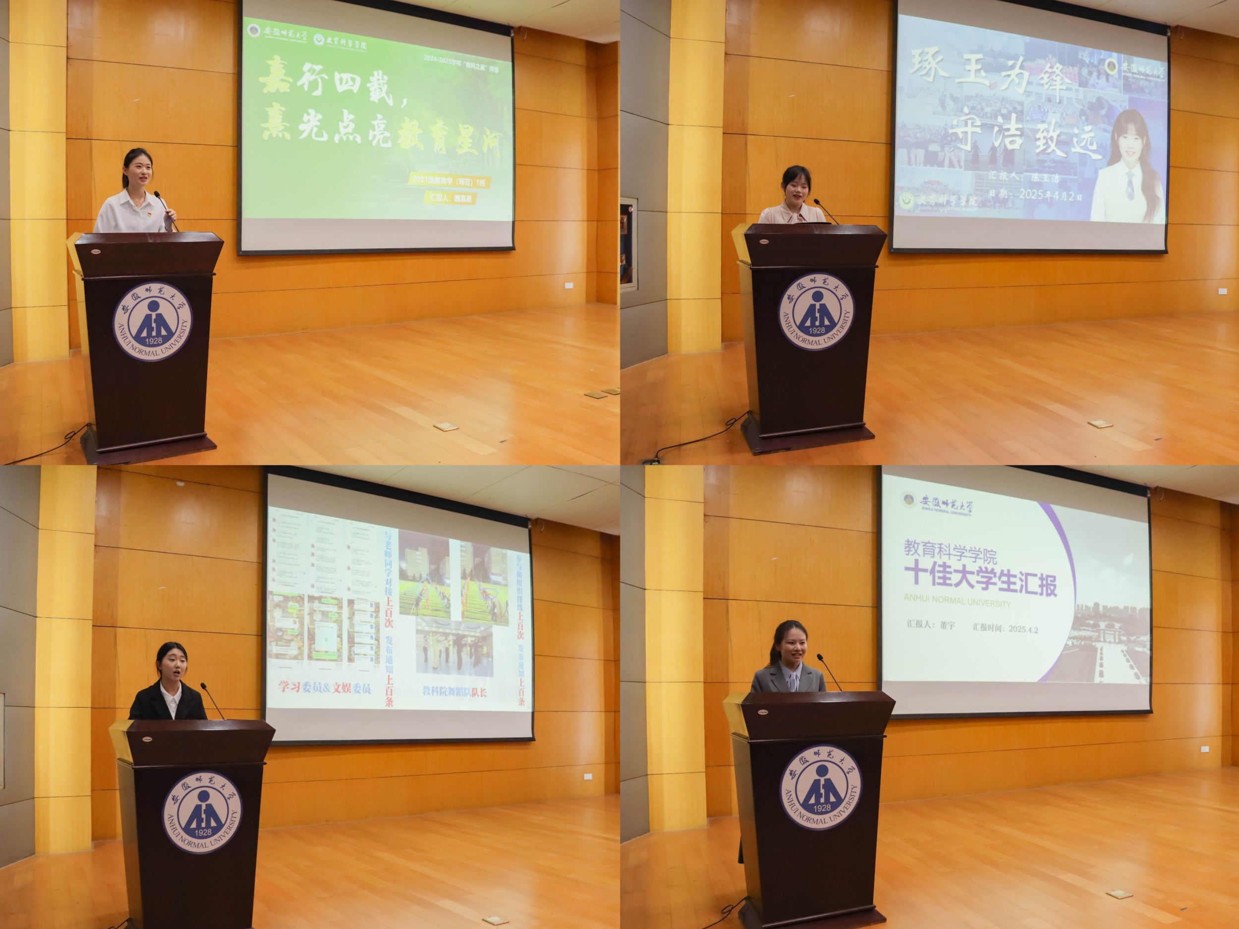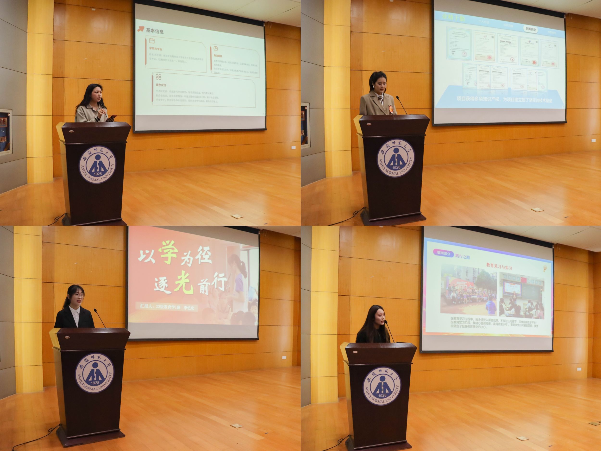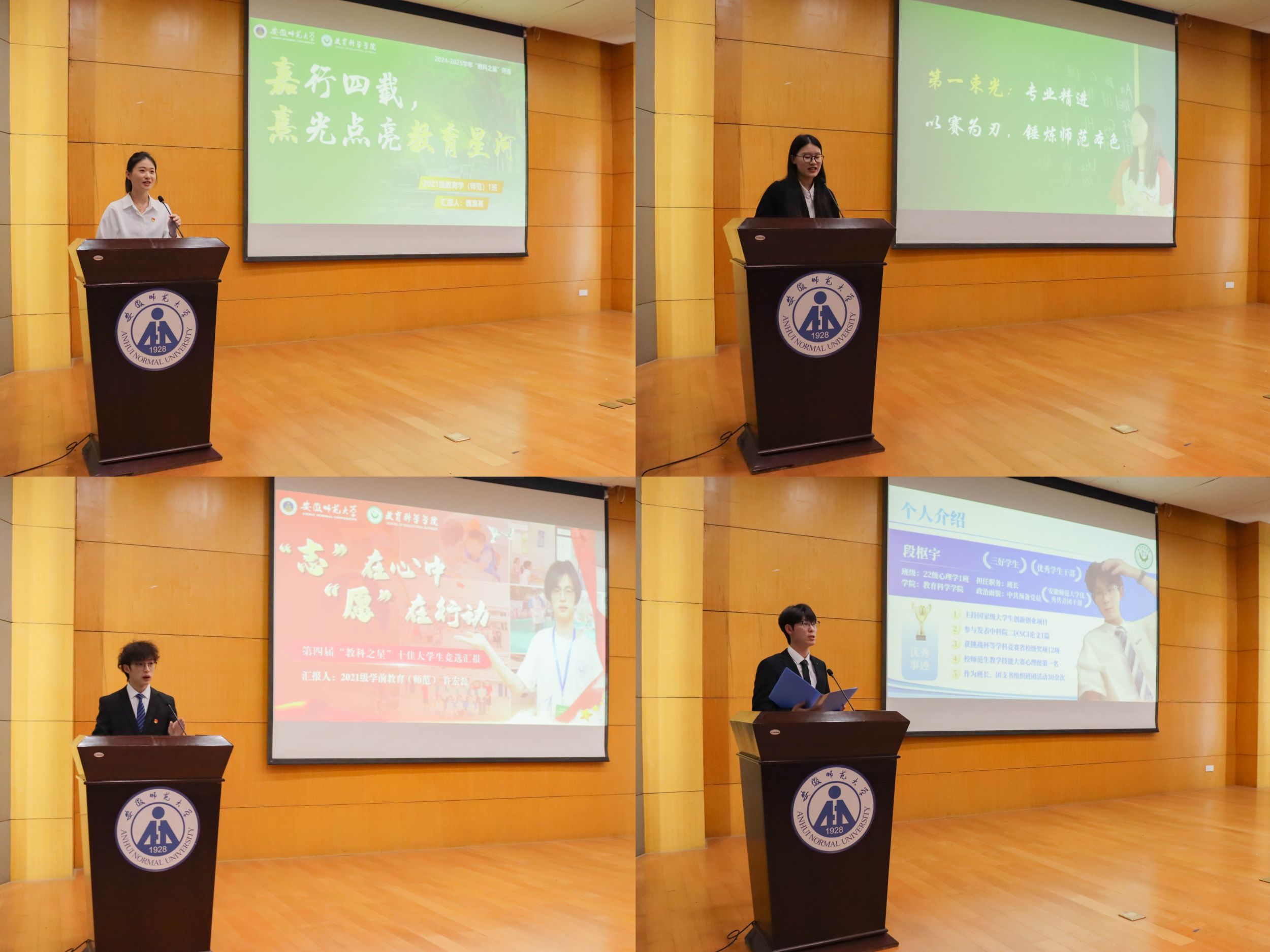经过自主报名,班级推荐,公司审核等环节,共23位候选人参与现场汇报答辩。候选人通过PPT展示,围绕“科技创新与自主创业”“道德示范与自强奋斗”“社会实践与志愿服务”“学风创优与生态保护”“文艺创作与体育锻炼”五个类别,结合学术学习、思想引领、学科竞赛、社会实践等经历与成果进行汇报,展现了师大优秀教科人“追求卓越,全面发展”的精神风貌和杰出风采。