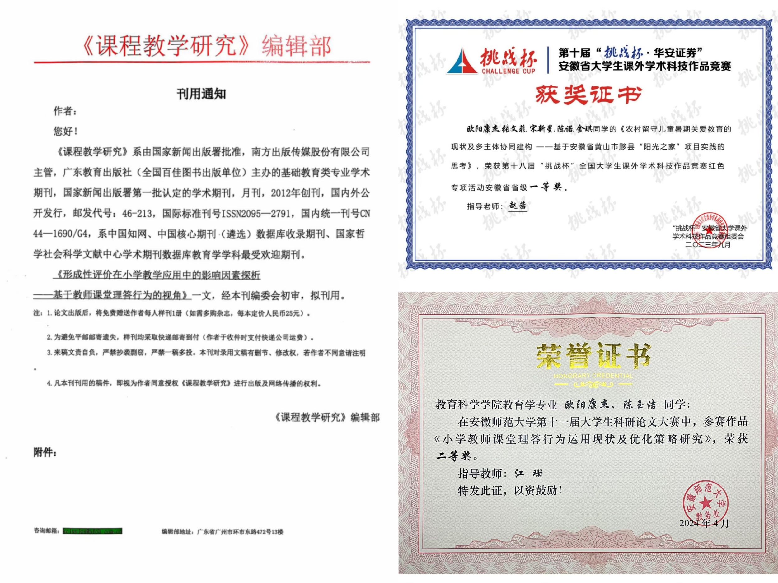 他以“挑战杯”“大创”为平台,践行“把论文写在祖国大地上”的科研理念,主持、参与各项研究项目。他以第一作者在《课程教学研究》杂志发表项目研究成果论文《形成性评价在小学教学应用中的影响因素探析——基于教师课堂理答行为的视角》,项目调研报告《小学教师课堂理答行为运用现状及优化策略研究》被评为教育学(师范)专业“优秀教育调查报告”,形成的政策建议文本被滁州市教育体育局采纳。