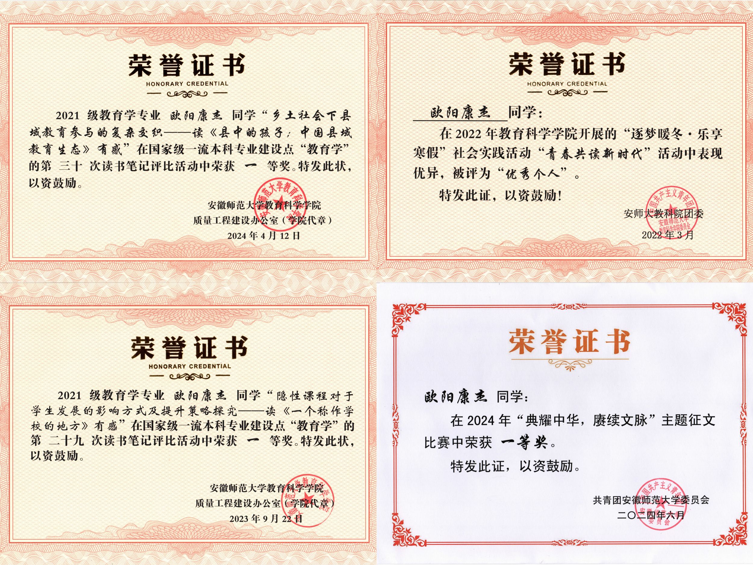 他还注重研究的现实关切,先后前往合肥市、芜湖市、滁州市、黄山市等各地调研。大学四年,他曾多次主持、参与各项科研项目,获第十一届“挑战杯”老员工学术科技作品竞赛校特等奖、第十一届“挑战杯”老员工创业计划竞赛校银奖、“三下乡”暑期社会实践优秀调研报告等。期间所主持的调研项目《农村留守儿童暑期关爱教育的现状及多主体协同建构》获得第十八届“挑战杯”全国老员工课外学术科技作品竞赛红色专项活动安徽省一等奖。