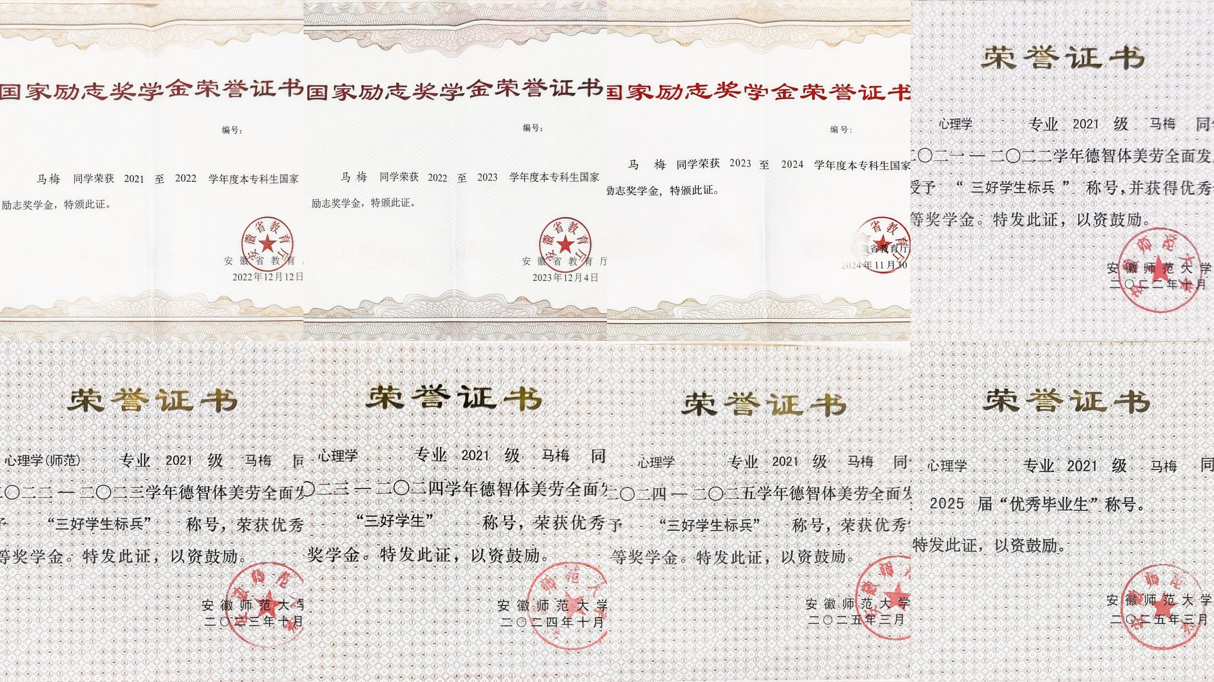 坚定信念,砥砺前行。大学期间,马梅不断积极地向党组织靠拢,现已发展成为一名中共党员。在党组织的引领下,她努力提升思想素质,想要在服务大众中发光发热。在实践上,主动担任老员工心理研究会志愿者组长,连续3年参加老员工心理志愿服务,开展心理健康课程20余次、开展团辅活动10余次。作为2022级心理学(师范)专业班导生,协助2022级辅导员管理班级事务,并为员工提供学业和生活上的帮助与支持,为学弟学妹们分享大创经验、教团队格证考试经验等,荣获“优秀导生”荣誉称号;连续2年参加3次暑期志愿服务活动,进行社区儿童心理志愿服务、繁昌区调研活动、留守儿童支教活动,撰写相关材料累计7篇,荣获“优秀青年老师”称号、暑期实践征文校级三等奖等荣誉。此外,还参与了轻轨志愿服务、“全心全益”志愿服务、“党员志愿服务30+”活动等多项志愿服务。累计志愿时长200小时以上,服务人数1000余人,服务次数100余次。