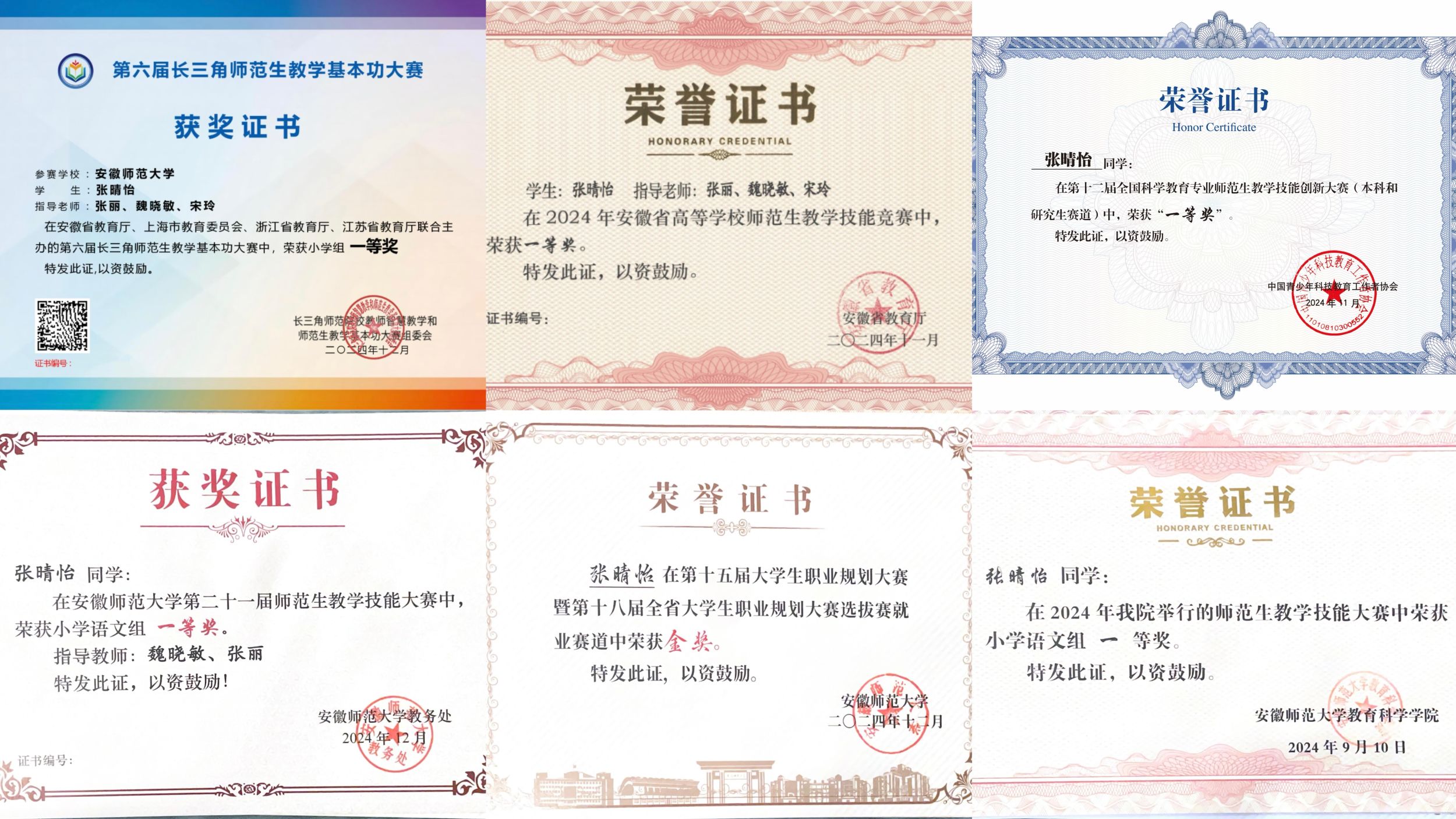 “千淘万漉虽辛苦,吹尽狂沙始到金”。张晴怡明白提升师范技能需要付出艰辛的努力和不懈的坚持。从入学起,她时常观看优秀教学案例视频,在一次次的模拟教学中,她不断总结经验教训,改进自己的教学方式,这些努力在各类比赛中得到了充分的体现。张晴怡在TapTap点点第二十届师范生教学技能大赛小学语文组中荣获校级二等奖,在第二十一届师范生教学技能大赛小学语文组中,她成功斩获校级一等奖。同年10月,在2024年安徽省高等公司师范生教学技能大赛小学语文组中,她一路过关斩将,荣获省一等奖。2024年11月,她更是在第六届长三角师范生教学基本功大赛小学组以及第十二届全国科学教育专业师范生教学技能创新大赛中,凭借扎实的教学基本功和出色的现场发挥,均荣获一等奖,用实力证明了自己在师范技能方面的卓越水平。
