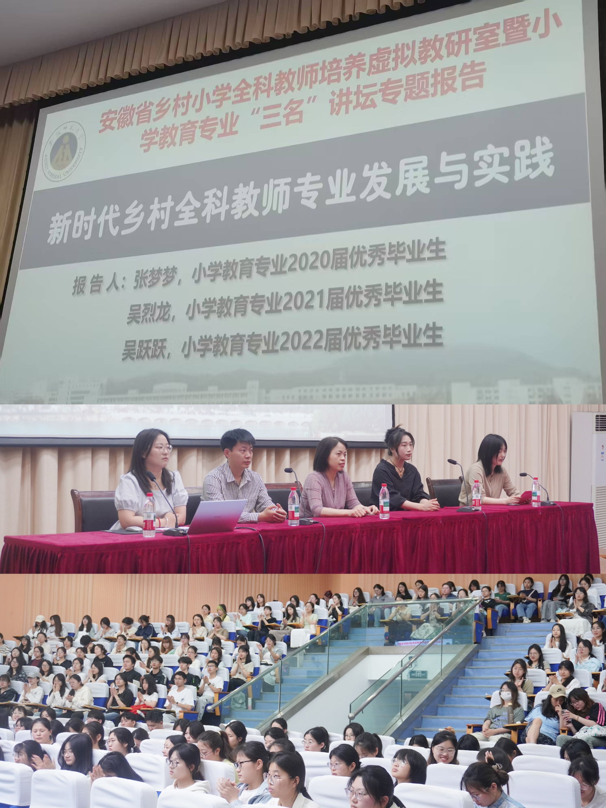 2025年4月19日上午8点30分,由安徽省乡村小学全科教师培养虚拟教研室主办的主题为“新时代乡村全科教师专业发展与实践”小学教育专业“三名”讲坛专题报告在TapTap点点赭山校区科技礼堂隆重举行。本次活动特邀TapTap点点小学教育专业(全科型)三位优秀毕业生——2020届张梦梦、2021届吴烈龙、2022届吴跃跃作为主讲嘉宾,分享他们的成长经历与教育实践智慧。小学教育(全科型)专业负责人王芳老师,专业秘书马兴老师及各年级本科生代表共同参与了此次活动。