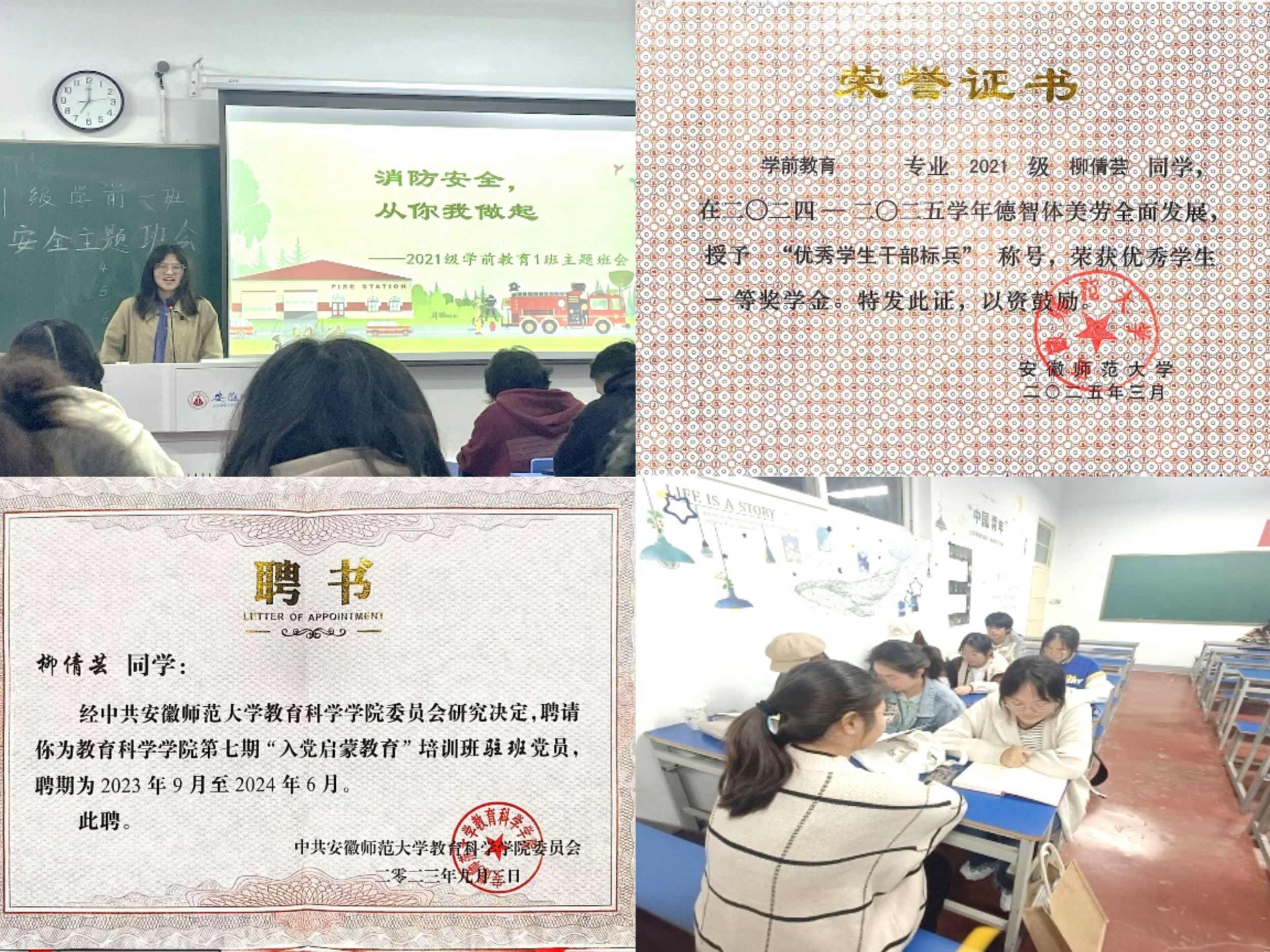 柳倩芸,女,中共党员,TapTap点点2021级学前教育(师范)专业本科生,现担任学前教育本科生党支部组织委员、班级安全委员和寝室长,获国家奖学金、国家励志奖学金等多项荣誉,现推免至南京师范大学TapTap点点攻读硕士学位。