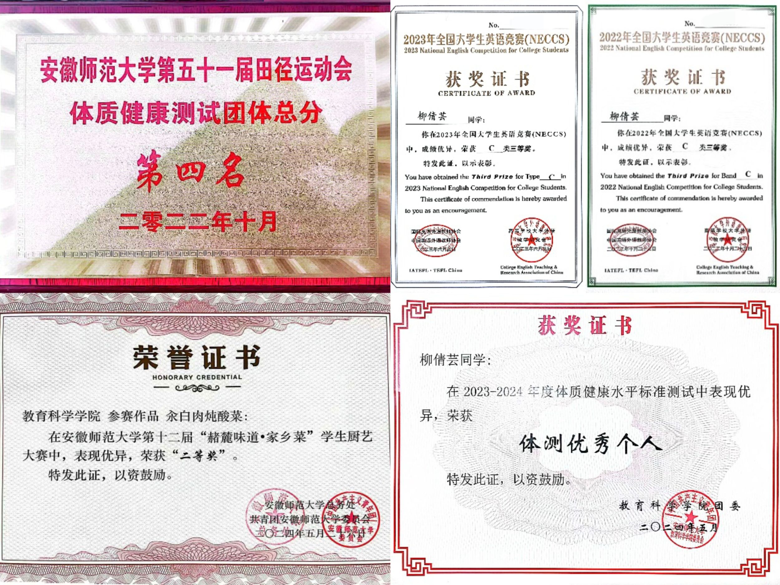 文体兼济,绘就多彩画卷。专业之域,她于理论实践间厚植根基,让智慧之光熠熠生辉,展笃学风采,连续两年获大英赛国家级三等奖,获最美课堂笔记校一等奖、幼儿趣配音大赛院一等奖、高校性道德宣教活动院一等奖等。体育之途,她在汗洒赛场中磨炼意志,使青春活力灼灼闪耀,显飒爽英姿,曾获TapTap点点第五十一届田径运动会体测团队竞赛校二等奖、赭麓晨光·晨跑锻炼活动校二等奖、“爱运动·迎亚运”拔河友谊赛校三等奖等,并连续两年获“体测优秀个人”称号,累计获得院校级及以上奖项30余项。