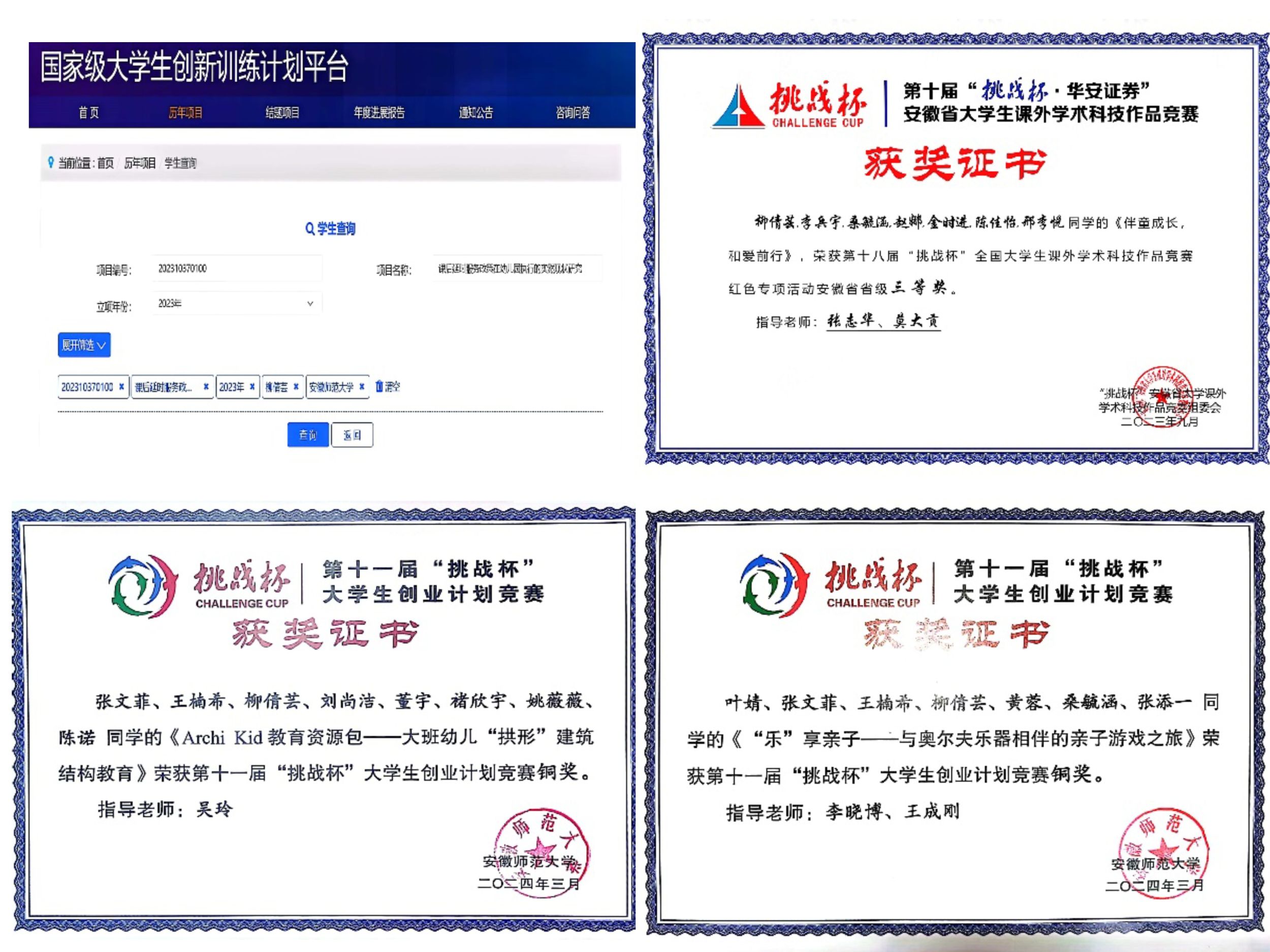 秉谦逊之态,迎未知之挑战。她积极开展科研工作,让理论在实践的土壤中生根发芽,结出创新的果实。作为国家级大创《课后延时服务政策在幼儿园执行的现状研究》项目第一主持人,顺利结项并完成科研论文一篇。在社会实践中,作为团队队长和调研组组长,她保持对公司产品的审视和反思,所完成的《社区混龄活动的同伴互动研究——以芜湖市丽城社区儿童暑期社区活动为例》调研作品获第十八届“挑战杯”全国老员工课外学术科技作品竞赛红色专项活动安徽省省级三等奖。作为核心成员参与两项项目,均获第十一届“挑战杯”老员工学术科技作品竞赛校级奖项。