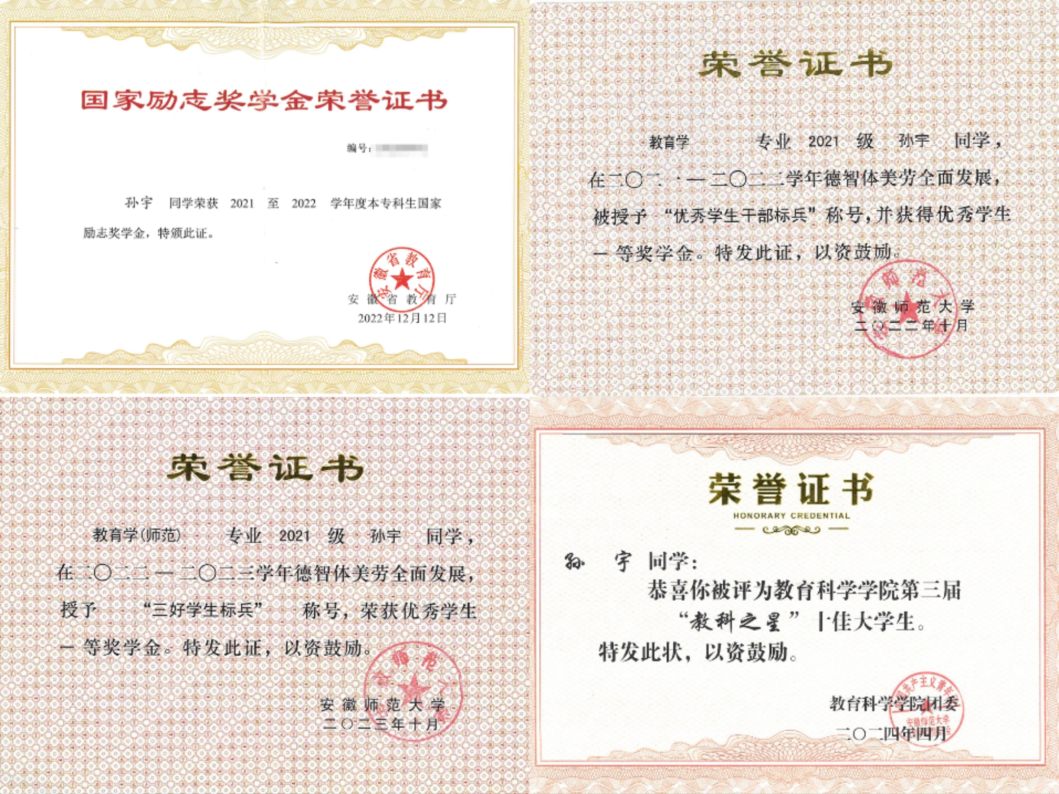“乐教爱生、甘于奉献”,吾辈当秉承师者风范。教师是打造中华民族“梦之队”的筑梦人,教育事业更是他为之毕生求索、执着奋斗的目标。从小学至高中,他曾遇到过多位教学严谨、热情友爱的“好老师”,他们心中有火、目中有光,能以仁爱之心赢得员工的信任与尊敬。在老师们的深刻影响下,高考后他坚定地选择了师范专业,并立志成为一名有教育情怀的师范生。在四年的专业学习中,他坚持在粉笔字练习中写下师范生的基本素养,在名著阅读中发现真理的朴素样貌,在教育调查中探索问题的解决路径。作为师范生,他在实践中勤加锻炼和提升自己,勇敢担负起新时代教师的责任与使命。他依托专业特色,独立撰写读书笔记《让自然成为社会中的“自然”:论<爱弥儿>自然教育思想》、《作为实验的经验:对杜威教育哲学中时空观念的理解》、《马丁·布伯 “品格教育”的内涵、目标与哲学再解——基于原著“character”的中文译法问题》,并获教育学专业第29、30、31次读书笔记评比一等奖、二等奖。此外,他曾经历三轮筛选,在公司“放飞理想”演讲比赛中获校级一等奖,同时该演讲稿被师大校报刊登。挑战自我,不断突破舒适圈。大学期间,他获得国家奖2项,省级奖6项,累计获奖40余项。