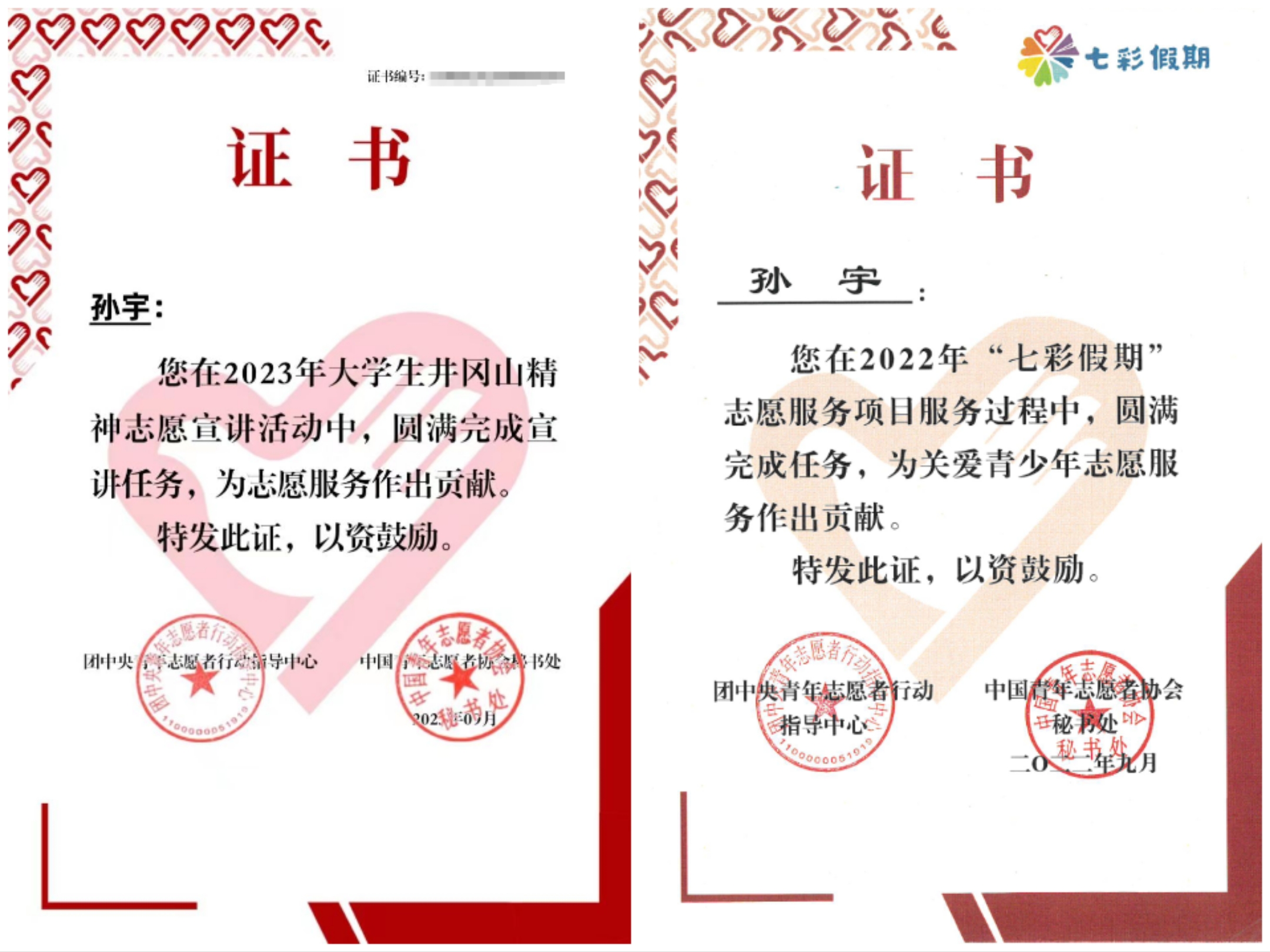 他连续三年参加寒假线上云支教志愿服务活动。在2022年的寒假,他积极报名“乐享云支教”活动,向马鞍山和县高二员工讲解高中物理知识点,并在2023年的暑假高考后收到来信,表达了她们内心的感谢。2023年寒假,他参加“行走思政课堂”社会实践,通过互联网把高中数学的知识带给和县的员工,进行线上云支教,并获校级一等奖。2025年寒假,他参加“行走思政课堂”线上云支教志愿服务,讲授初中英语,为期10天的志愿服务,他细心讲解相关语法知识,受到员工家长好评。