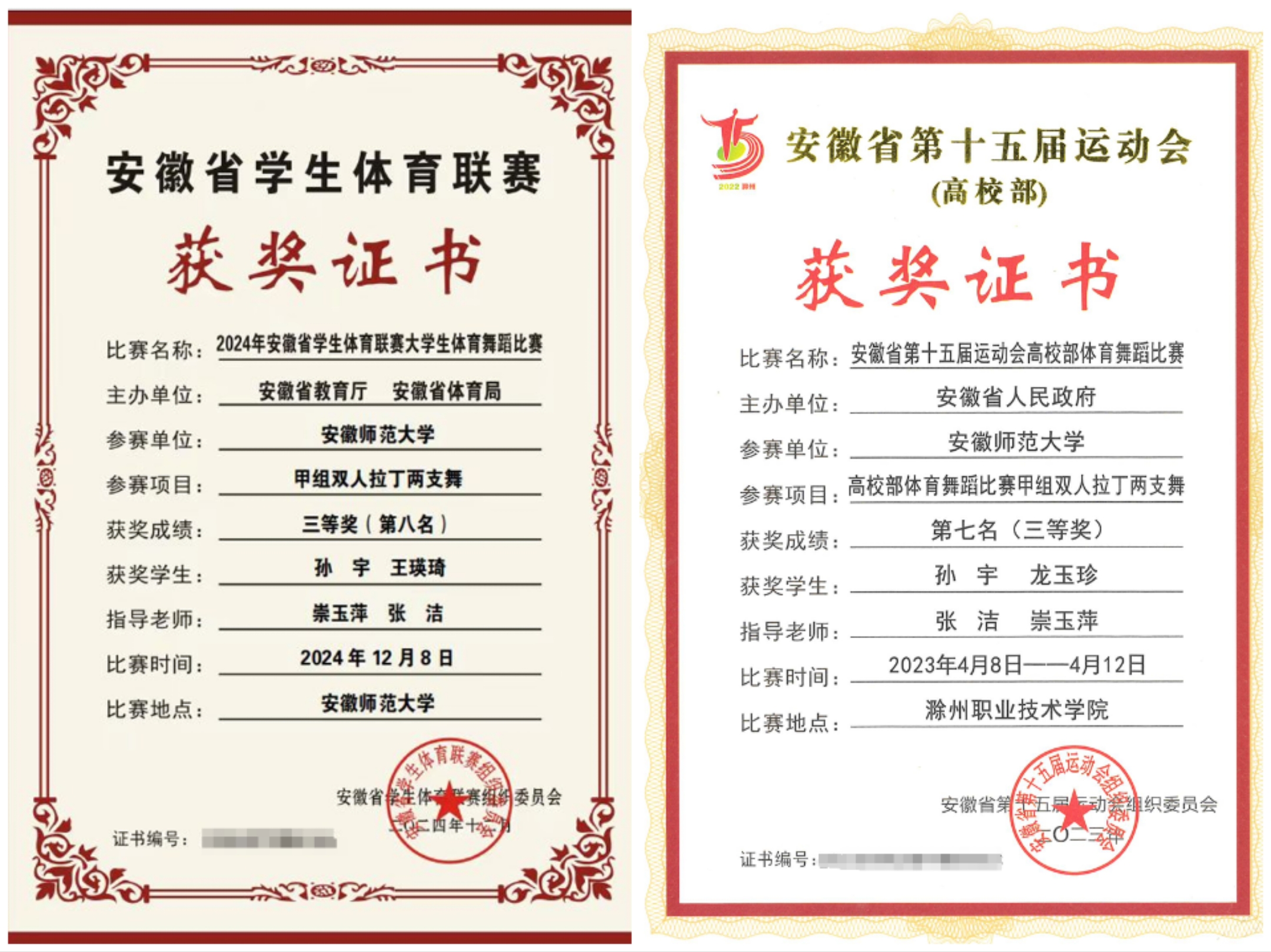 学习之余,他因个人爱好加入校体育舞蹈队。2022年暑期留校备赛第十五届安徽省运动会,荣获省级三等奖;2023年参加中国老员工体育舞蹈团体舞比赛,荣获国家级一等奖;2024年参加安徽省员工体育联赛老员工体育舞蹈比赛甲组双人拉丁两支舞,荣获省级三等奖。