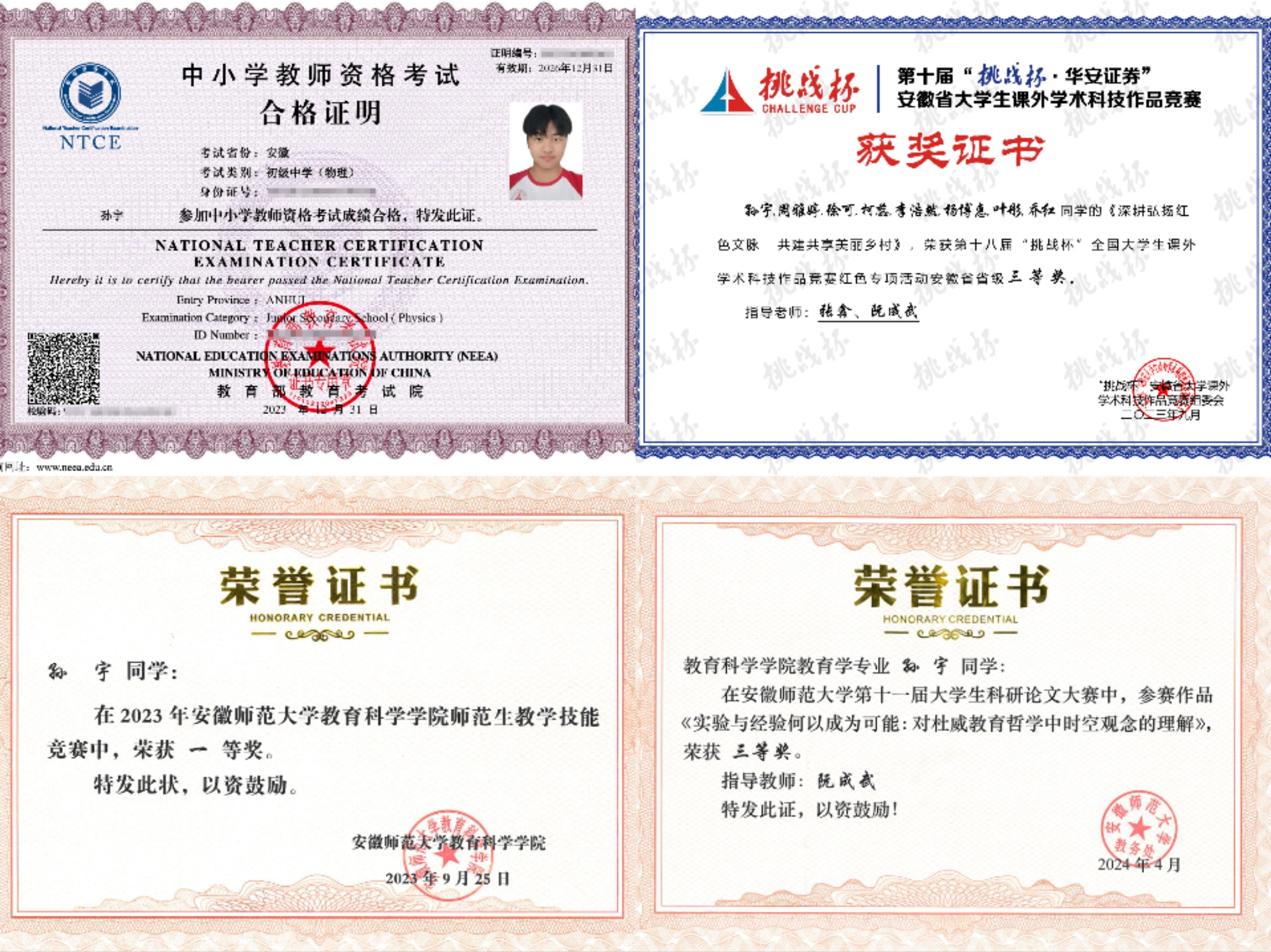 竞赛使人共享智慧,行稳致远。他作为第一主持人成功申报省级老员工创新训练项目《义务教育公司作业评价改革现状及优化策略研究》,同时作为核心成员参与导师组内国家级老员工创新训练项目《社区教育赋能义务教育课后服务促进家校社协同育人的路径探索》。他作为第一负责人完成《安徽省中小员工红色资源了解程度及继承弘扬意愿的调查研究》,获第十届“挑战杯”红色专项安徽省三等奖。