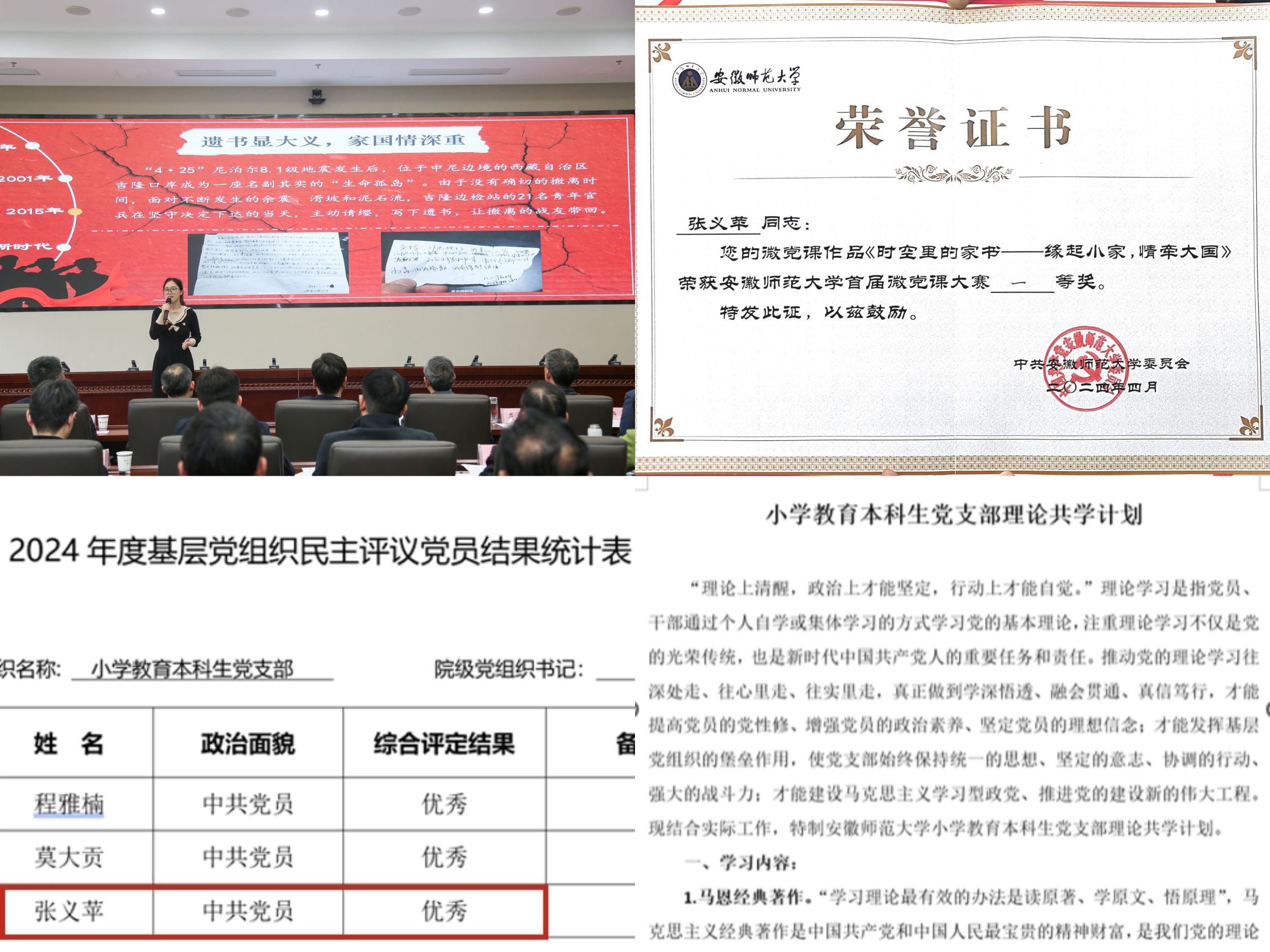 追随榜样的脚步,她不断向党组织靠拢,在大二成为了一名光荣的中共预备党员,后担任党支部组织委员。她恪守职责,将发挥党员的先锋模范作用做为自己学习工作的目标。累计组织参与三次党员发展答辩大会,独立撰写党支部理论共学计划,多次协助完善不同年级的党员档案整理等工作。在年度民主评议中获评优秀等级。由她主讲的微党课作品从全校九十多件作品中脱颖而出,作为党支部和公司唯一代表参加公司首届微党课大赛,和16名师生党员同台竞技,最终获得了员工组第一名、校级一等奖的好成绩,作品进一步被推选至省赛。作为一名党员,她在追随榜样的同时也努力为成为榜样而不懈奋斗着。
