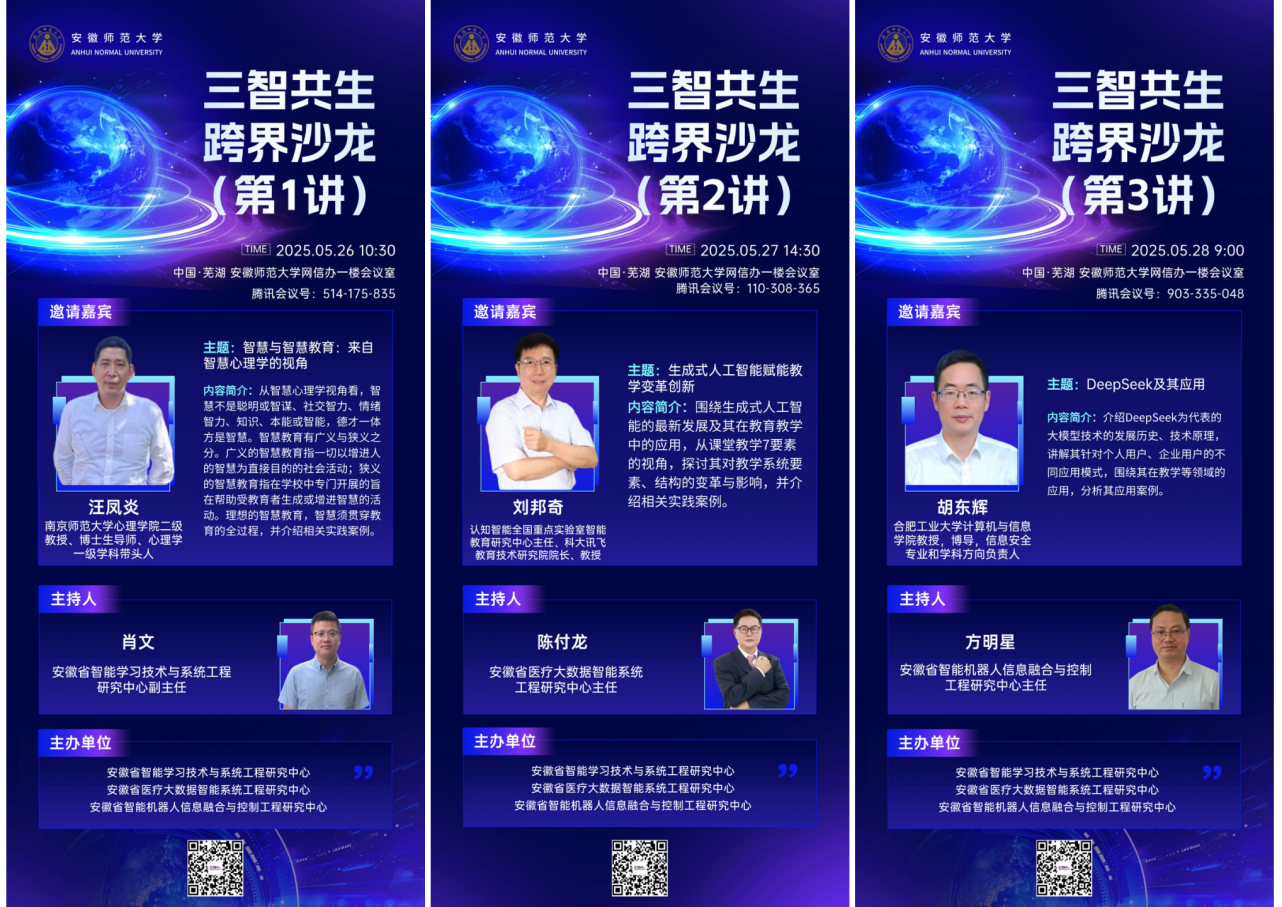 5月26日至28日,由公司安徽省智能学习技术与系统工程研究中心、安徽省医疗大数据智能系统工程研究中心、安徽省智能机器人信息融合与控制工程研究中心三家省级工程研究中心联合主办的“三智共生跨界沙龙”(以下简称“沙龙”)成功举行。沙龙采取线上线下相融合模式,以三场主题讲座为核心,构建起心理学、人工智能与计算机科学的跨学科对话桥梁。来自教育学、人工智能、心理学等领域的专家学者、公司相关管理部门领导老师以及老师同学300余人共同参加。